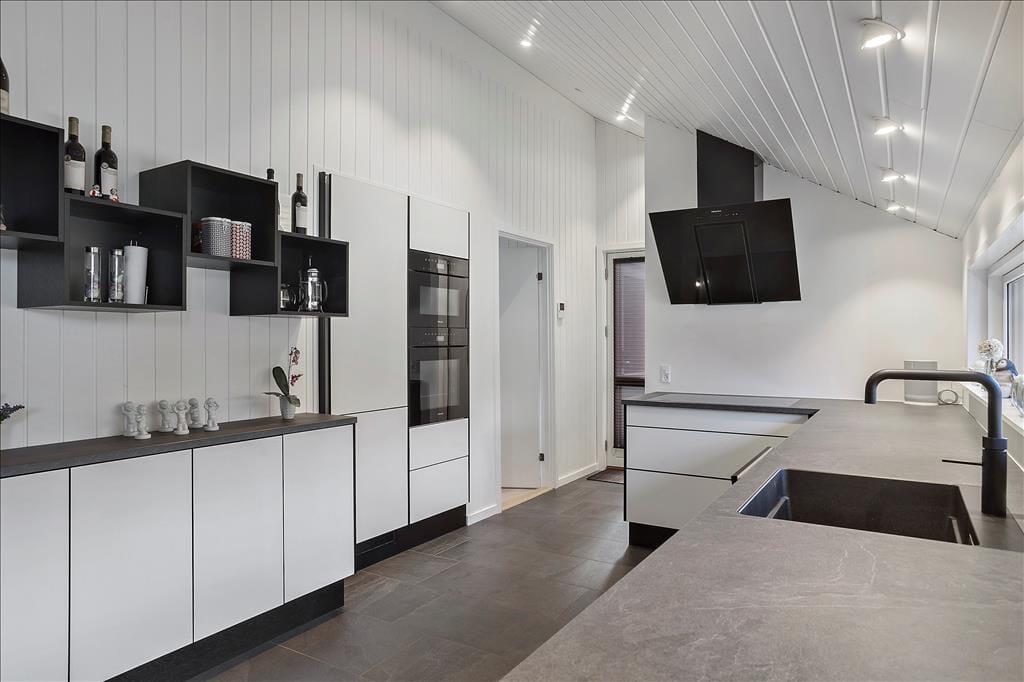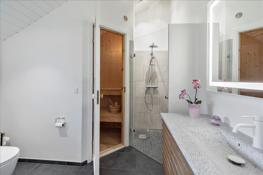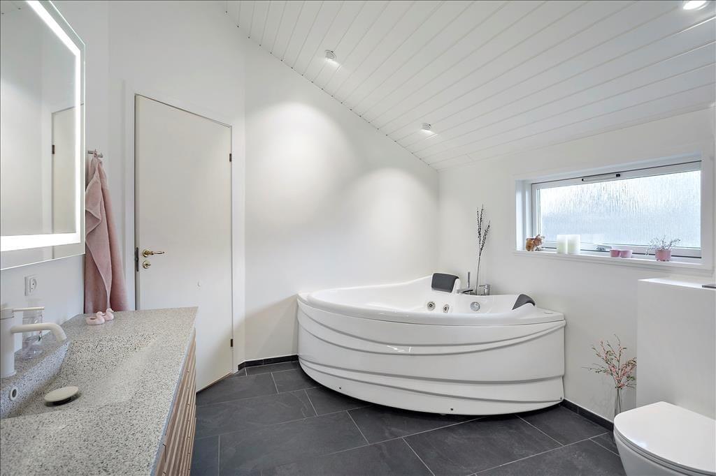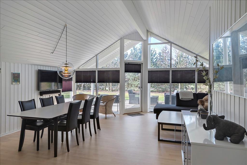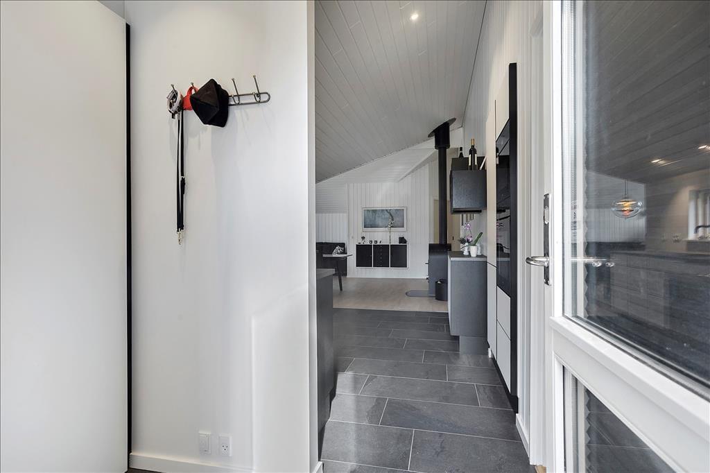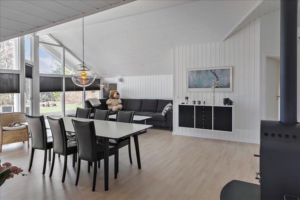 Fritidshuset indeholder: Entre, 3 gode soveværelser, 1 lækkert badeværelse med bruser, WC, spa og sauna, skønt køkken-alrum med spiseafdeling tæt på, stor stue med sofaområde, samt udgang til en hyggelig delvidst overdækket træterrasse.