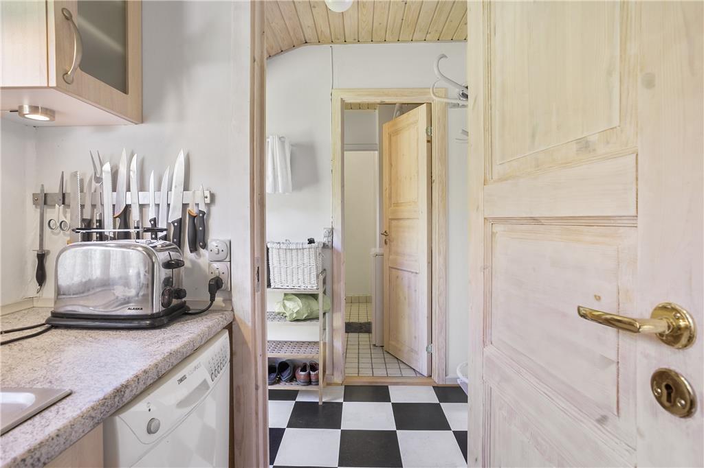 Godt indrettet fritidshus med indgang til en lille entré, hvorfra der er adgang til badeværelset samt det ene soveværelse. Videre gang fra entréen og ind i køkkenet, som indeholder alt hvad der til ferien behøves. I stuen står der et spisebord nær køkkenet, mens der i den anden ende af stuen både er blevet plads til lænestole, sofa, tv og en brændeovn. Fra stuen er der videre gang til husets 2 soveværelse, samt udgang til den dejlige overdækkede terrasse og haven.