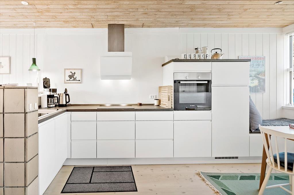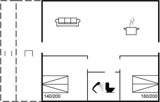 Sommerhuset indeholder: 2 gode soveværelser, med to enkeltsenge i det ene soveværelse og en dobbeltseng i det andet soveværelse, derudover har sommerhuset et dejligt nyt køkkenalrum med brændeovn og sofaområde, samt udgang til terrasse på begge sider af boligen, den ene terrasse er overdækket. Derudover et nyrenoveret badeværelse med wc og brusekabine.