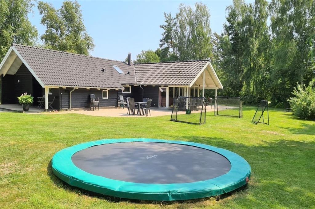 Ferieboligen er beliggende på en stor grund. Til ferieboligen hører 60 m² terrasseareal hvoraf 14 m² er overdækket terrasse. Gynge. Sandkasse. Trampolin. Fodboldmål. og parkering lige ved ferieboligen.