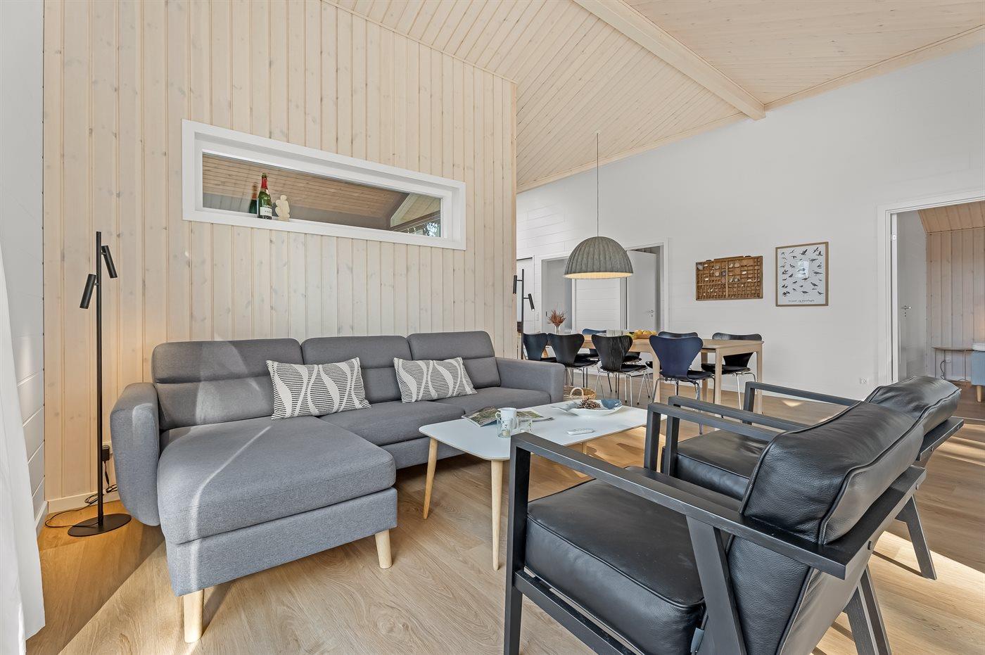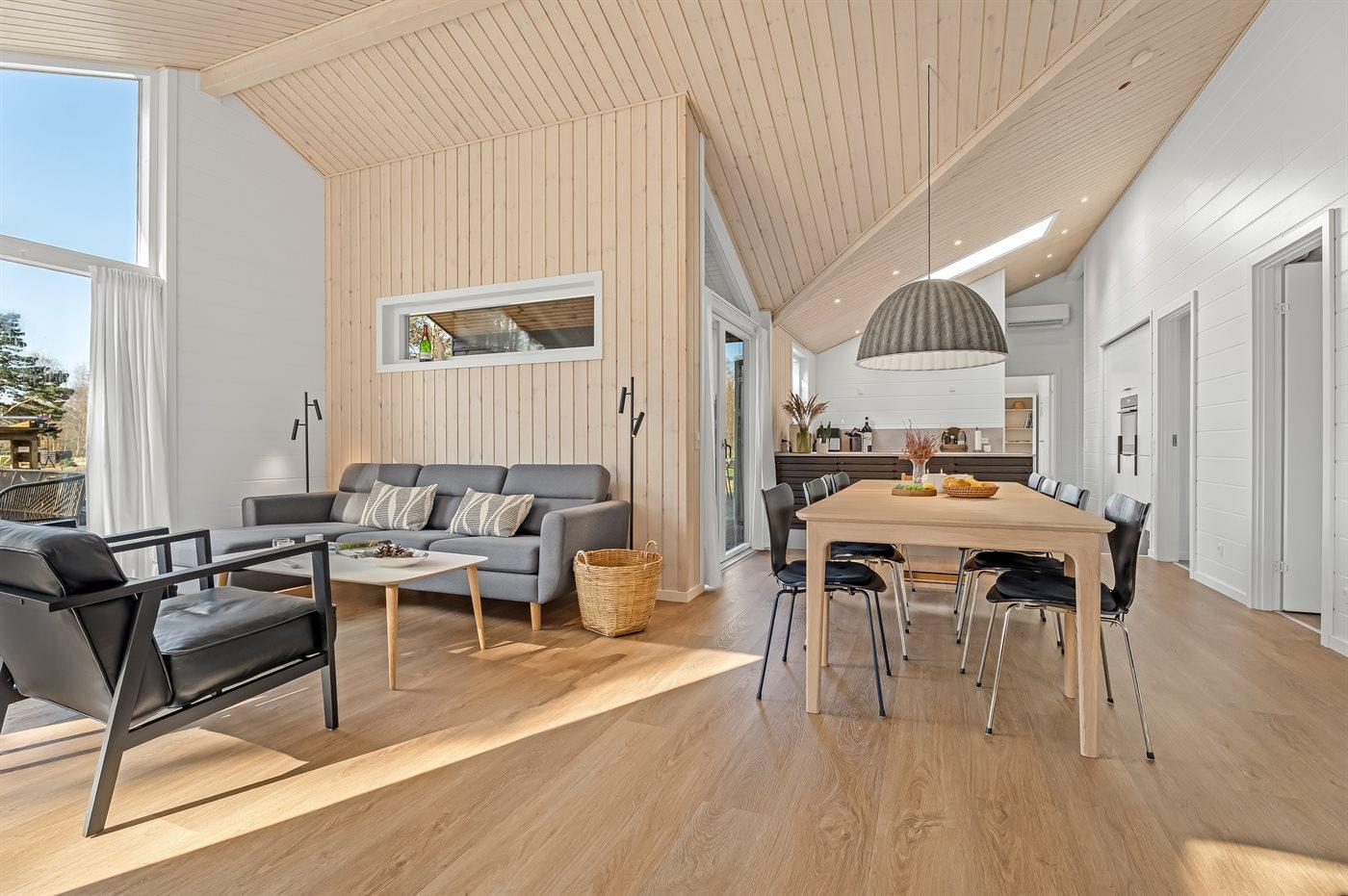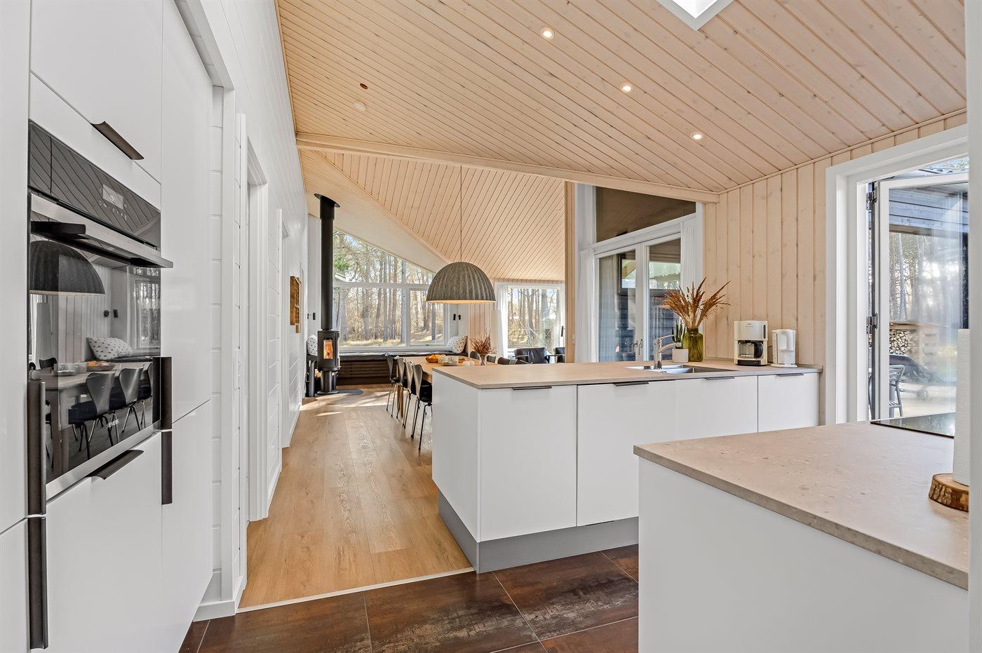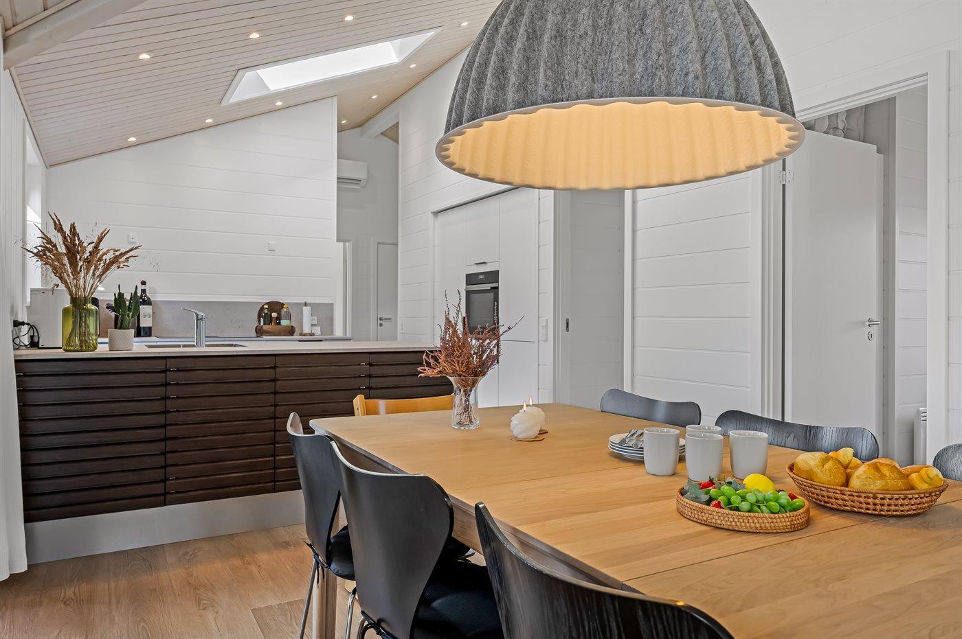 Boligen er indrettet med et stort og indbydende køkken-alrum med et flot, moderne køkken. Stuen er lys og hyggelig med store vinduespartier og døre, der giver et dejligt kig til haven og skaber en åben og venlig atmosfære.