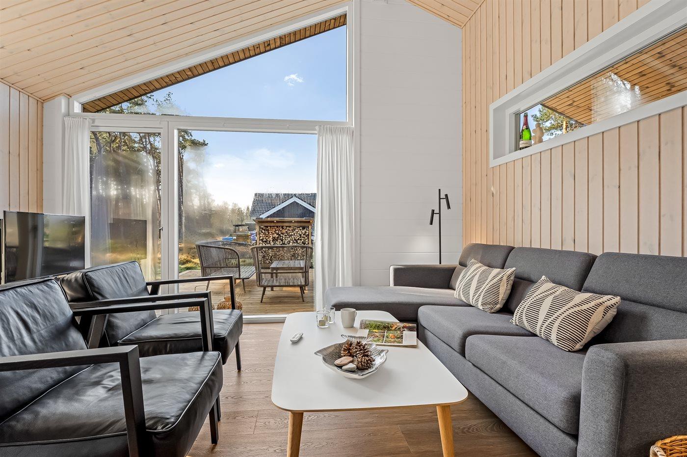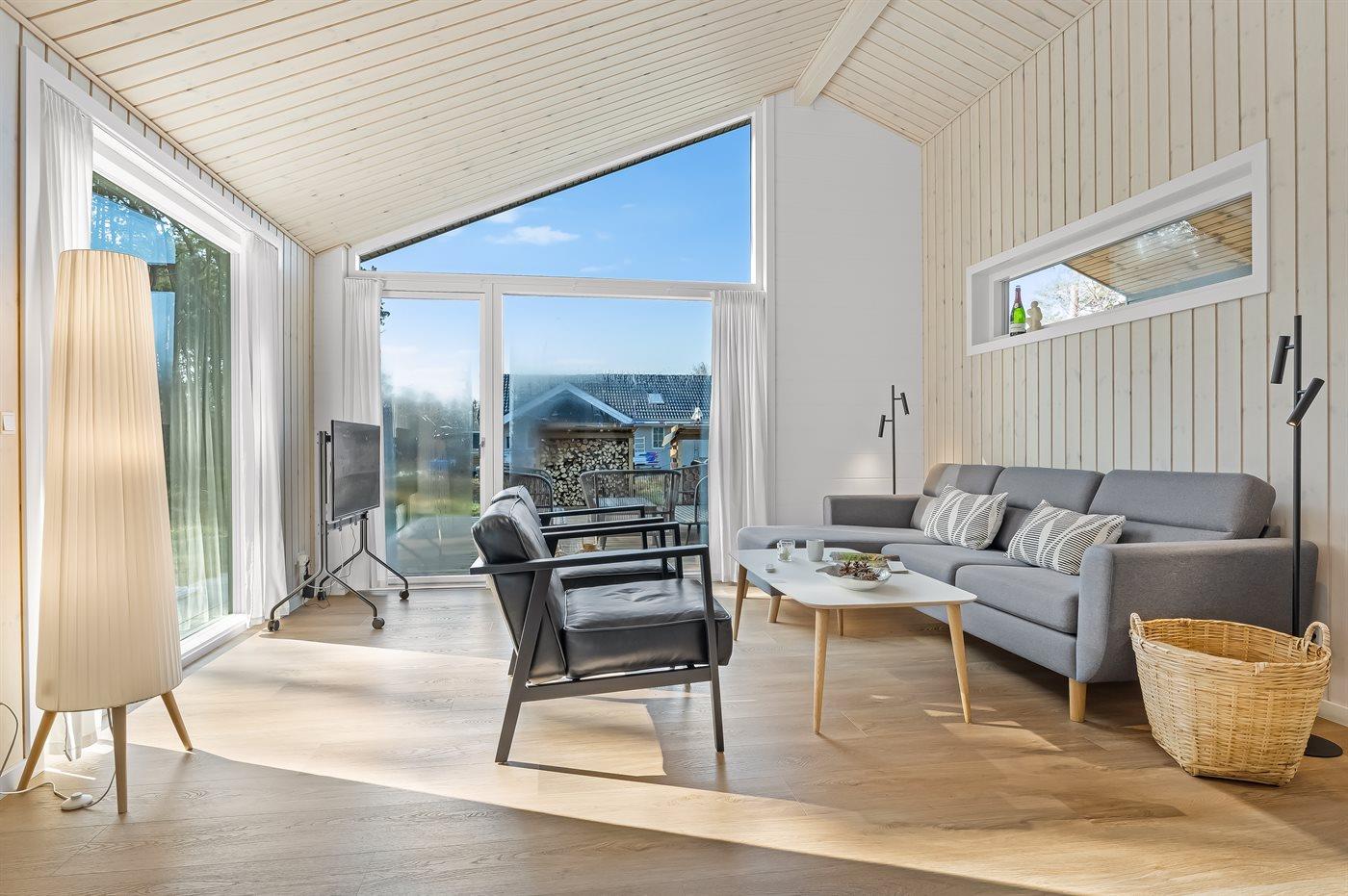 Udendørs kan I nyde en skøn træterrasse med havemøbler og elektrisk grill – perfekt til afslappende feriedage og hyggelige aftener.