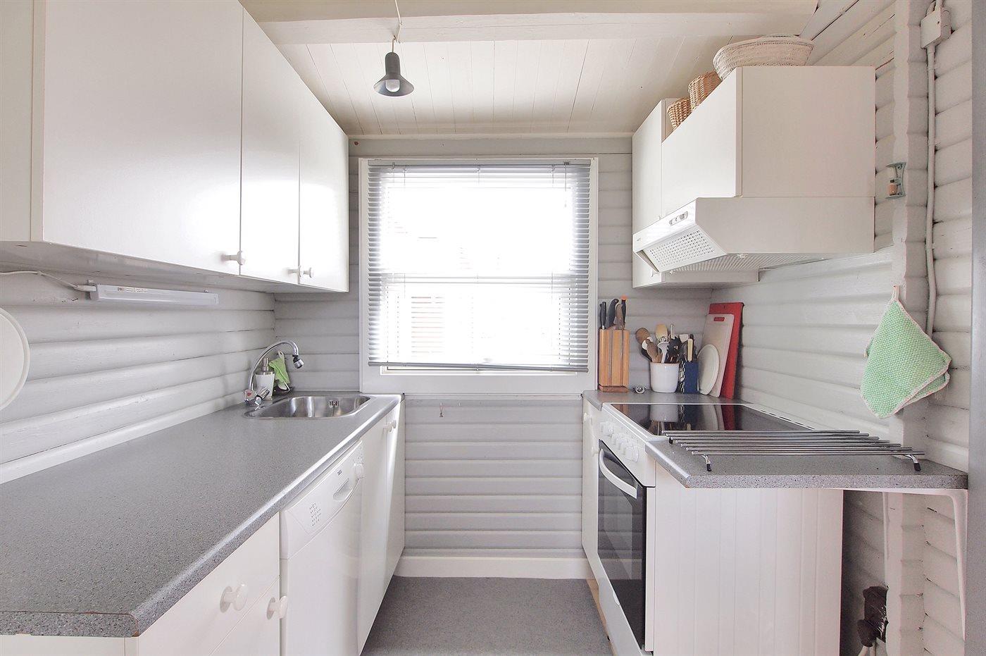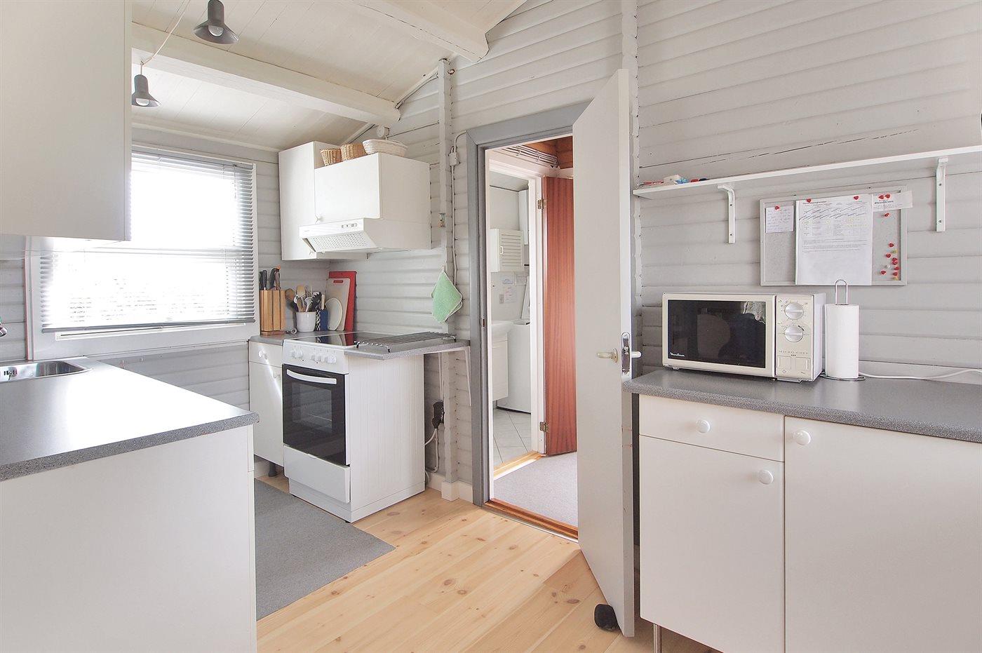 Køkkenet er udstyret med 1 køleskab. Der er 4 keramiske kogeplader, varmluftovn, mikrobølgeovn samt opvaskemaskine.