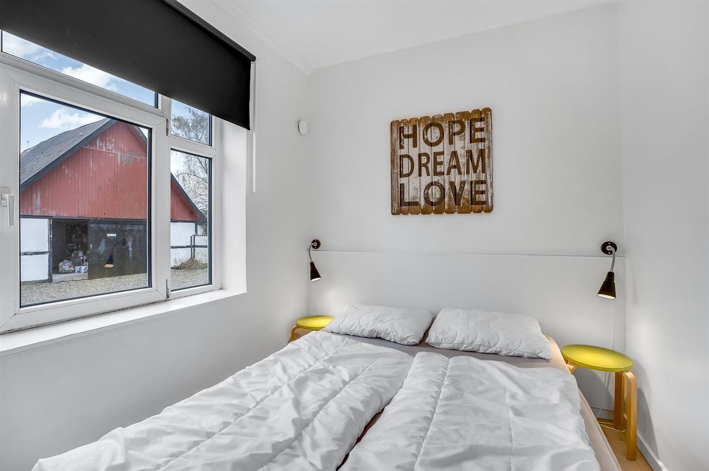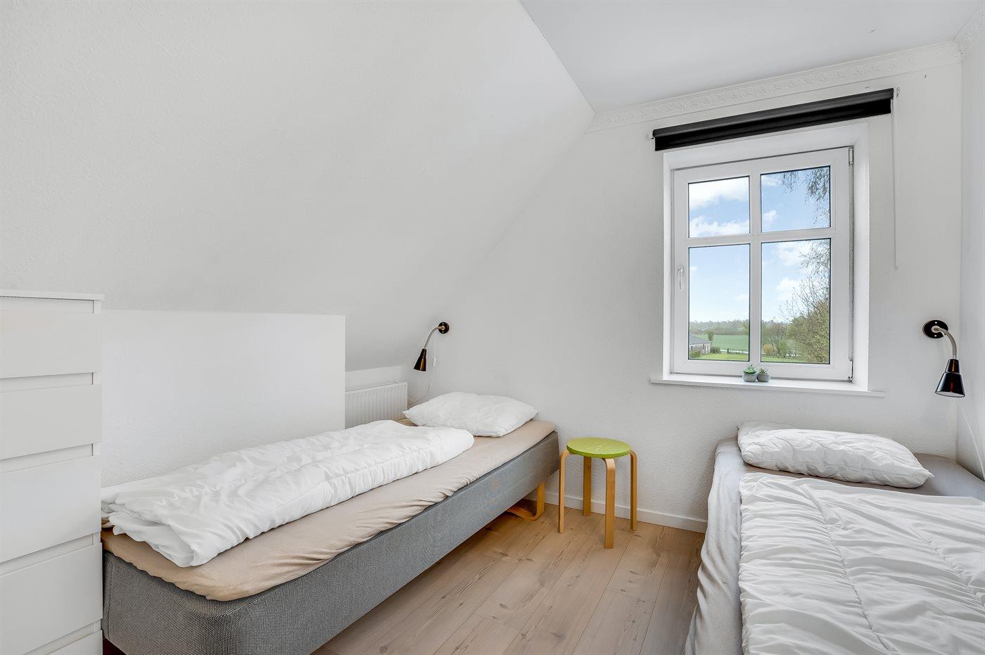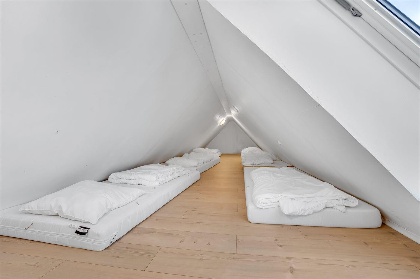 Der er i alt 9 soveværelser. Sovepladserne fordeler sig på: 4 sovepladser i dobbeltsenge. 14 sovepladser i enkeltsenge. 6 sovepladser på madrasser. 6 af disse sovepladser befinder sig på husets hems. Derudover er der 2 stk. barnesenge.