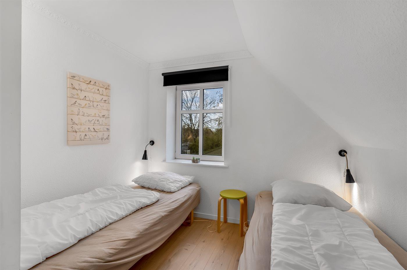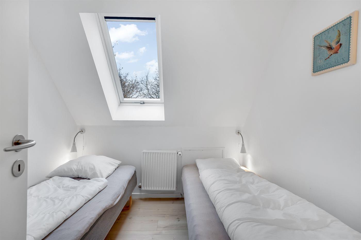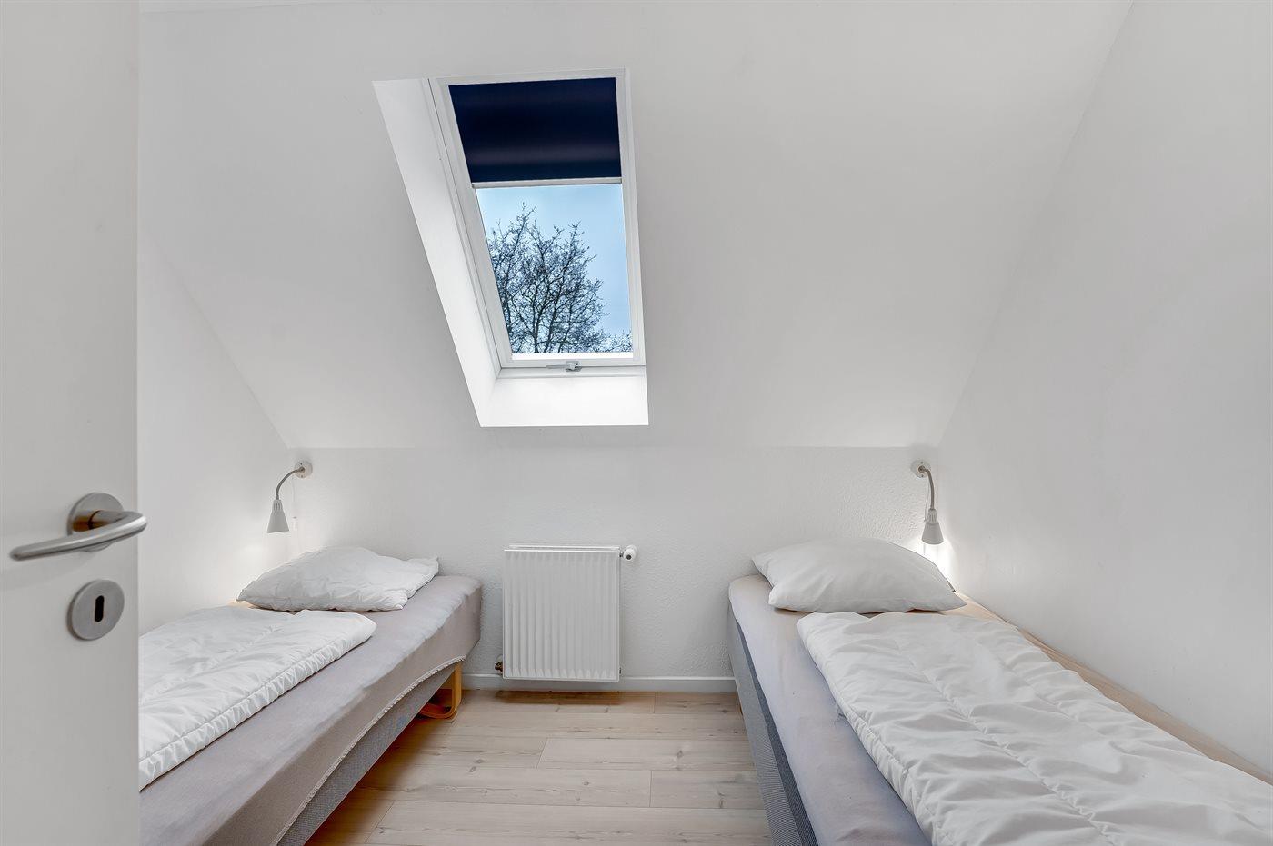 Der er i alt 9 soveværelser. Sovepladserne fordeler sig på: 4 sovepladser i dobbeltsenge. 14 sovepladser i enkeltsenge. 6 sovepladser på madrasser. 6 af disse sovepladser befinder sig på husets hems. Derudover er der 2 stk. barnesenge.