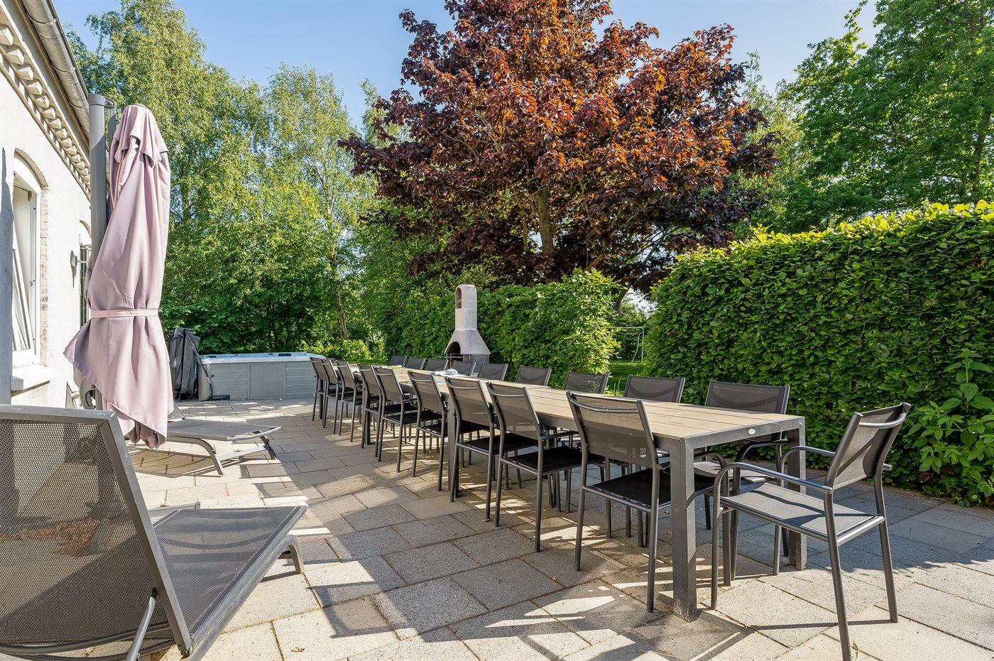 Stor feriebolig i naturskønne omgivelser med aktivitetsrum, udendørs pool og spa, perfekt til flere familier.