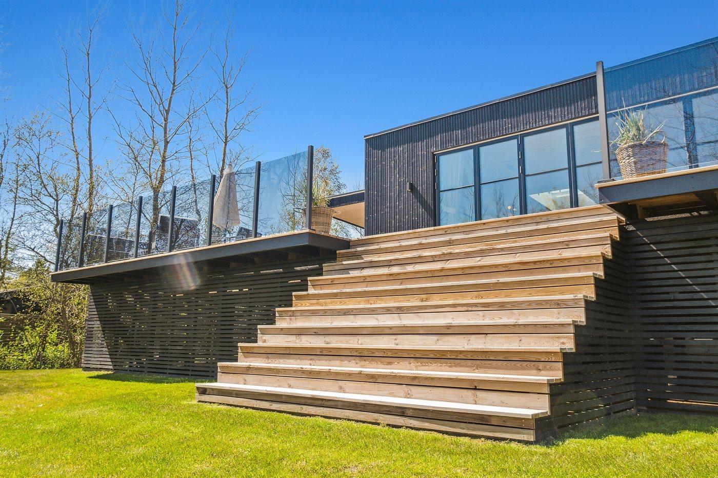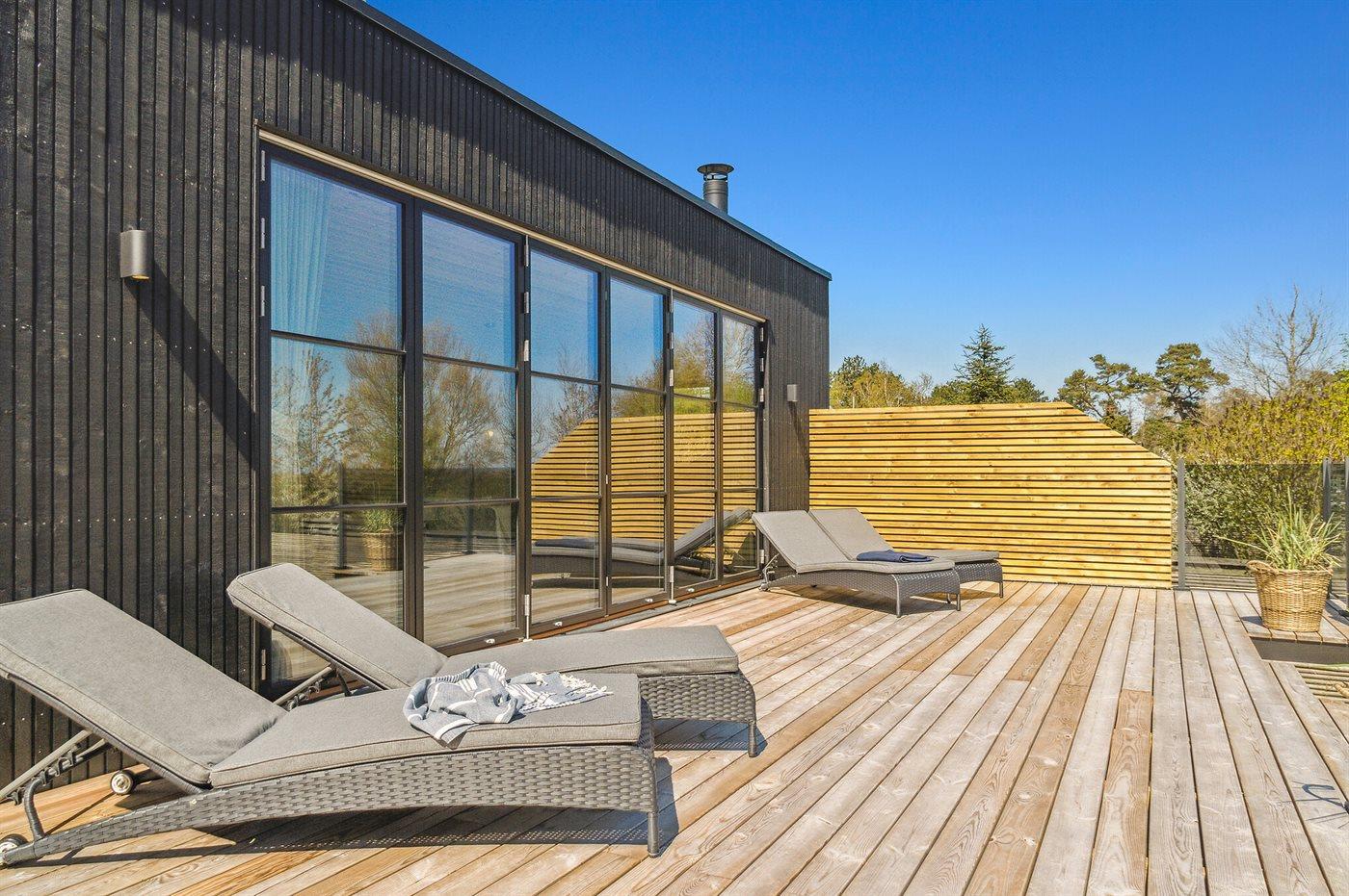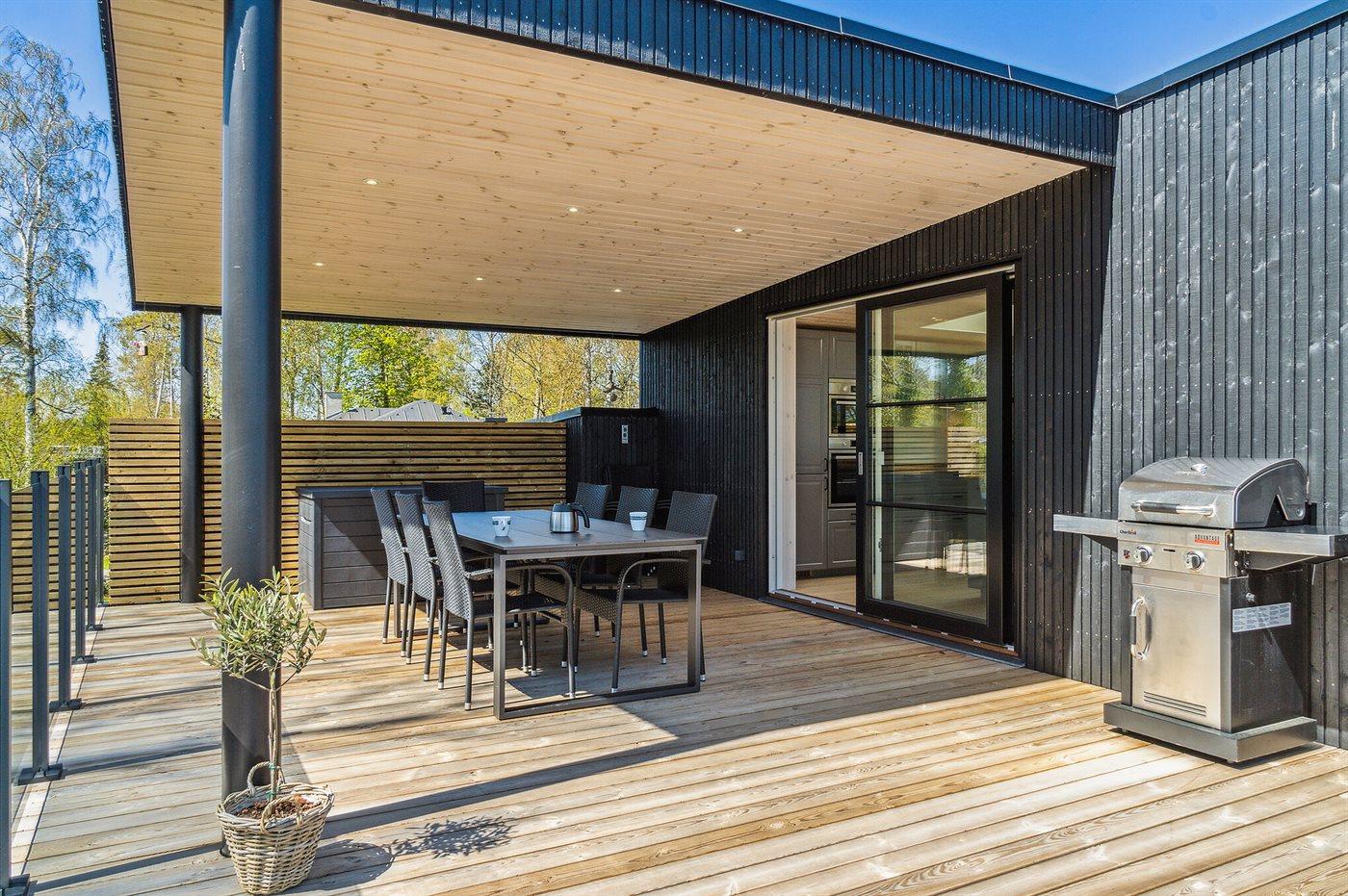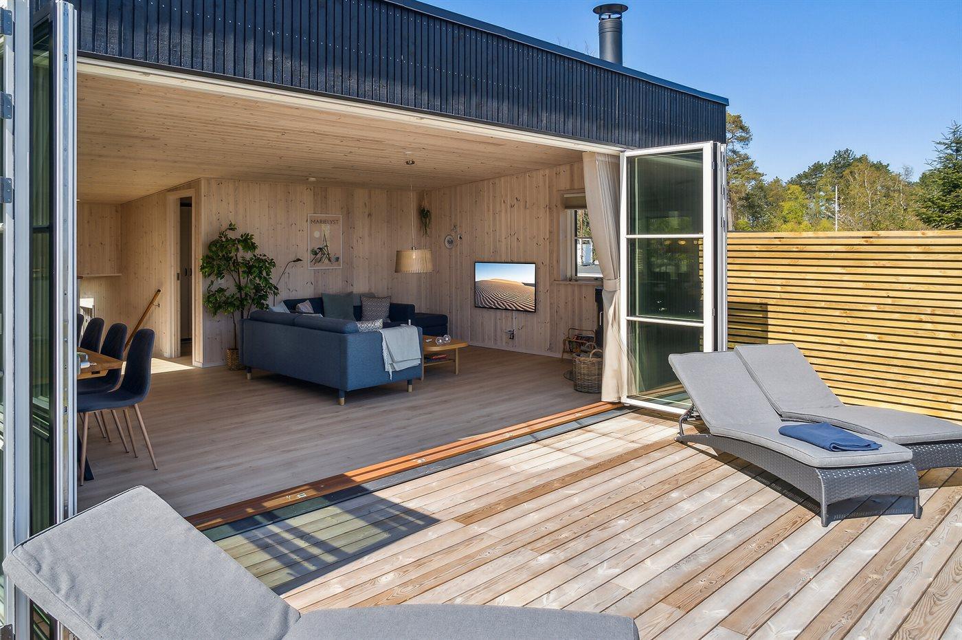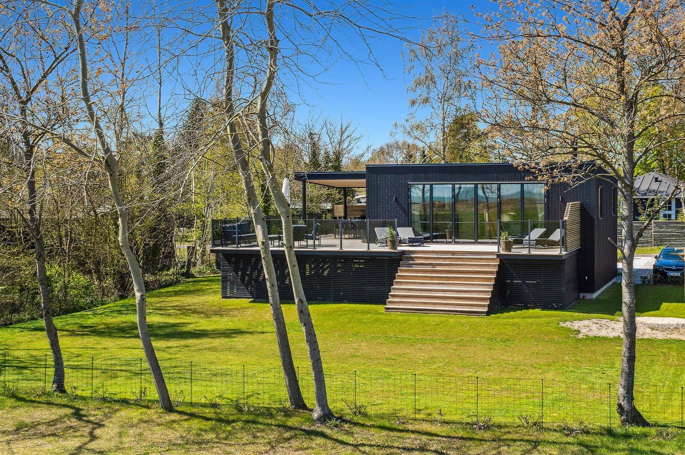 Et helt nyt sommerhus i første række med fantastisk udsigt ud over vandet. Sommerhuset er indrettet, så man fra stuen kan gå direkte ud på en stor terrasse. Vinduerne fra stuen kan køres helt til siden, så man får et virkeligt stort område at nyde den fantastiske udsigt fra.