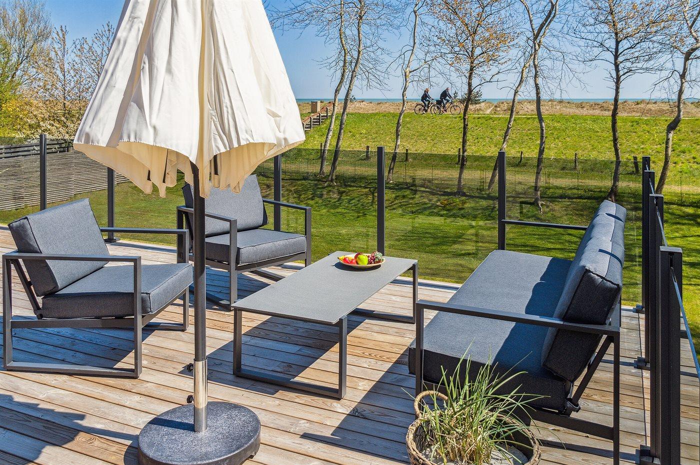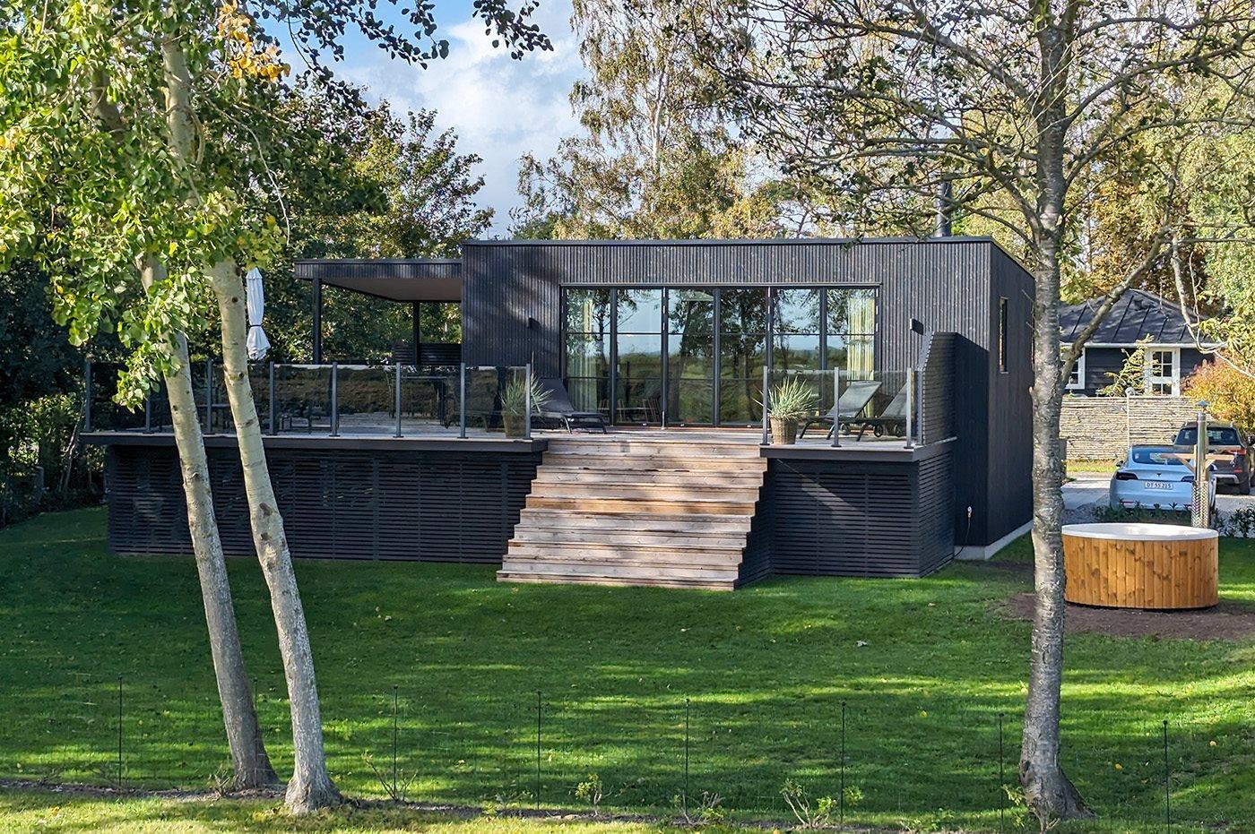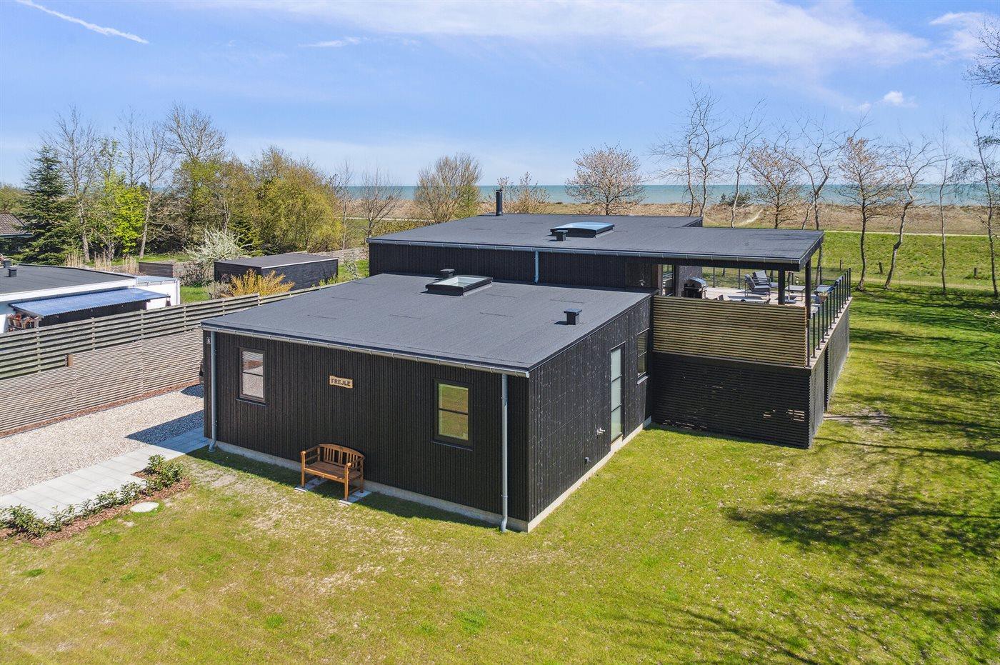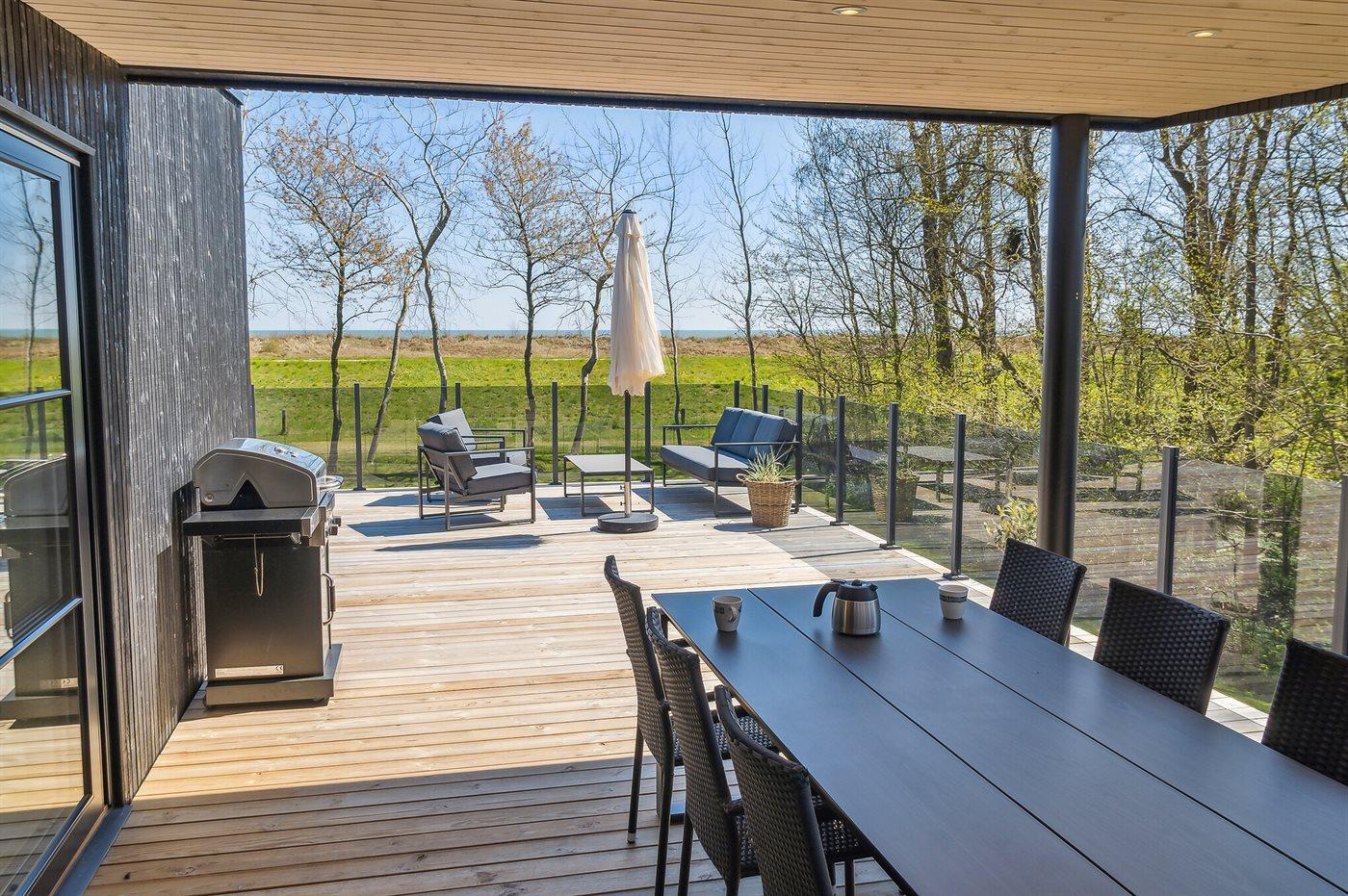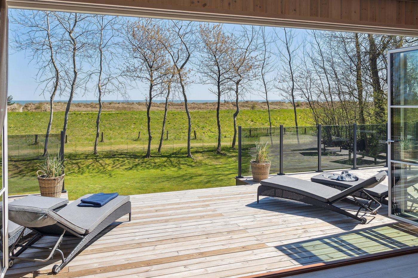 Nyt sommerhus i første række med havudsigt, stor terrasse og vildmarkskar i Marielyst.
