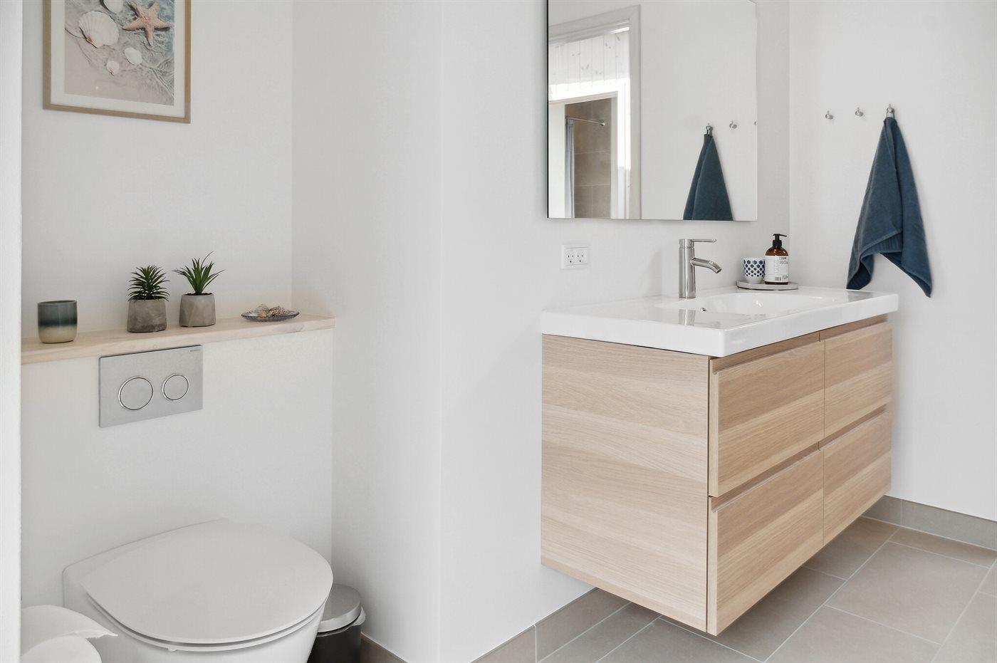 Der er 2 badeværelser med bruseniche og 2 toiletter. Der er gulvvarme på 2 badeværelser.