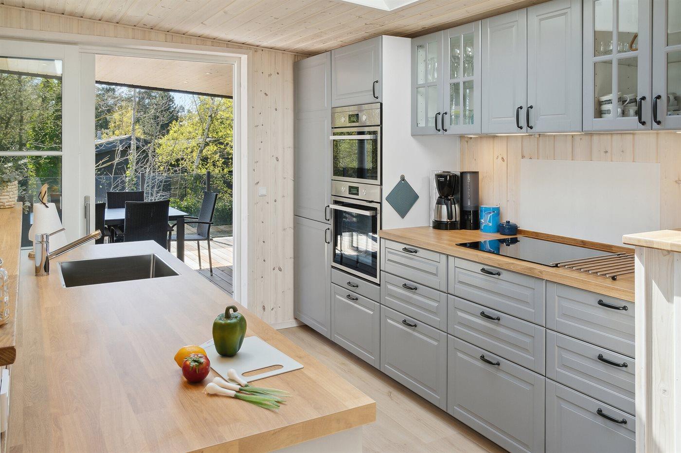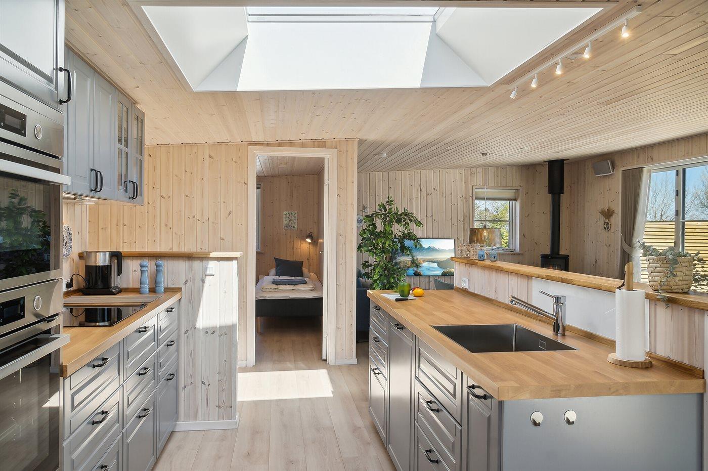 Køkkenet er udstyret med 1 køleskab. Der er 4 induktionskogeplader, varmluftovn, mikrobølgeovn samt opvaskemaskine.