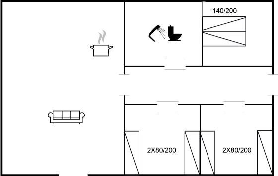 Der er i alt 3 soveværelser. Sovepladserne fordeler sig på: 2 sovepladser i dobbeltseng. 4 sovepladser i enkeltsenge. Derudover er der 1 stk. barneseng.