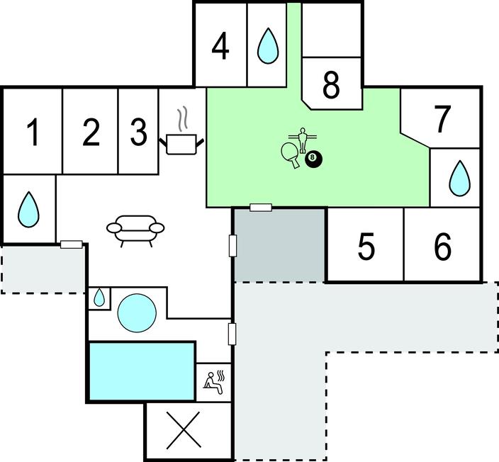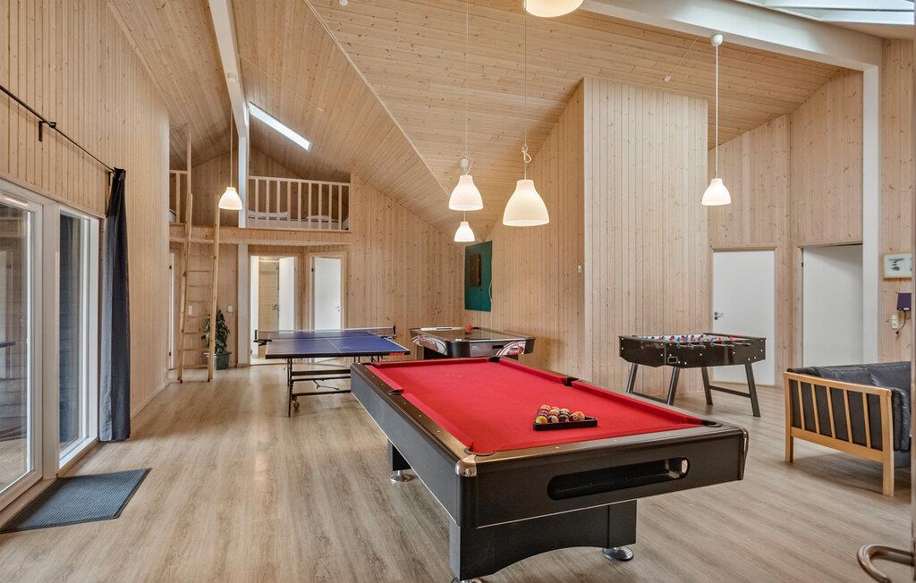 Tilbring fantastiske feriedage i dette dejlige feriehus, der er særligt velegnet til større familier eller vennegrupper. Glæd jer til en gennemtænkt planløsning, masser af plads og mange forskellige fritidstilbud hele året rundt. Træd ind i den åbne opholdsstue med højt til træloftet, brændeovn og flere hyggelige siddeområder. Spil en omgang bordfodbold, billard eller bordtennis sammen i aktivitetsrummet, eller nyd samværet ved det lange spisebord. Tilbered jeres livretter i det moderne køkken, eller slap af i spabadet efter en tur i poolen med rutsjebane. Der står også en sauna til rådighed.