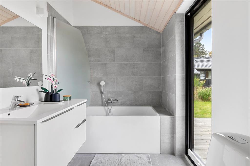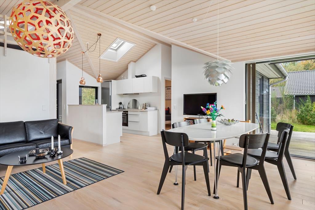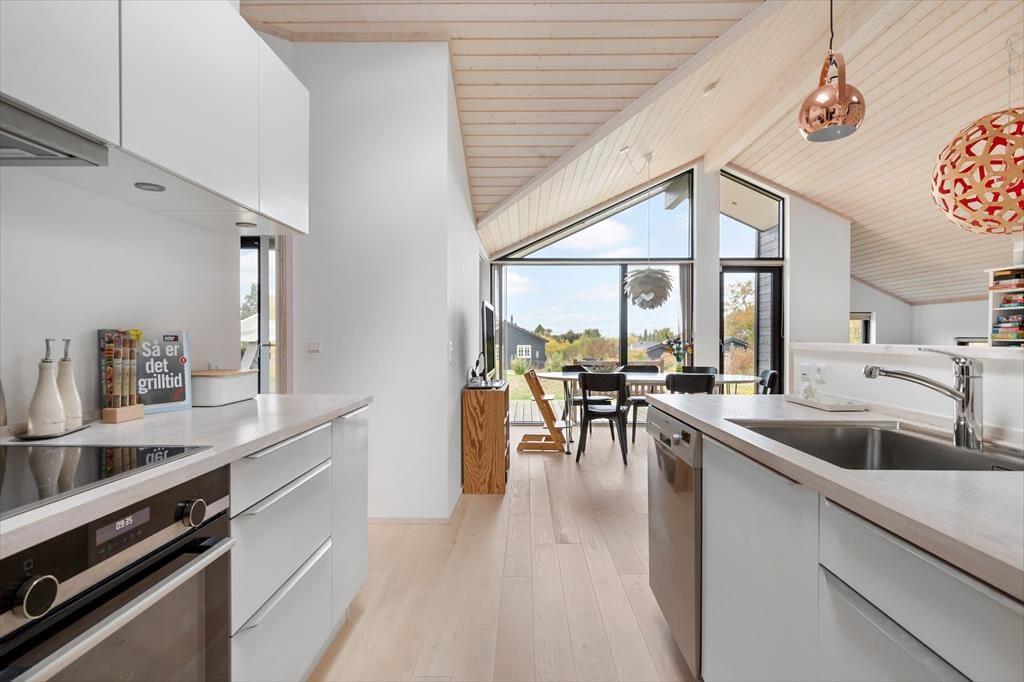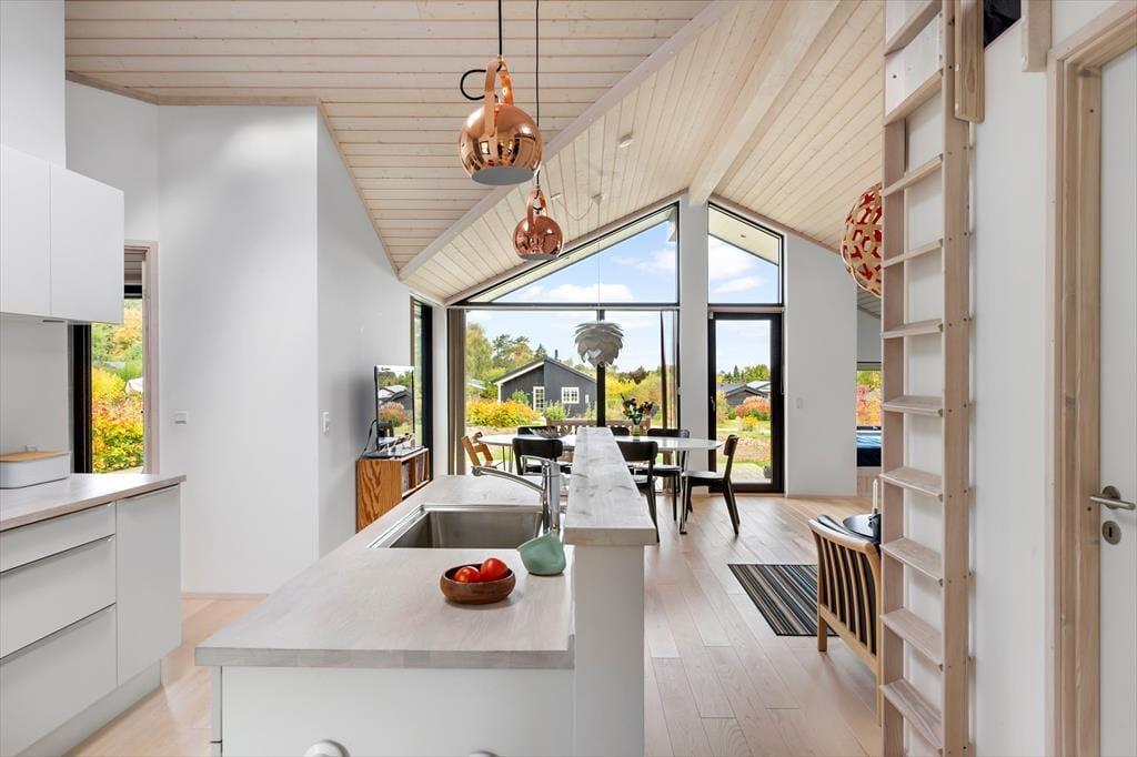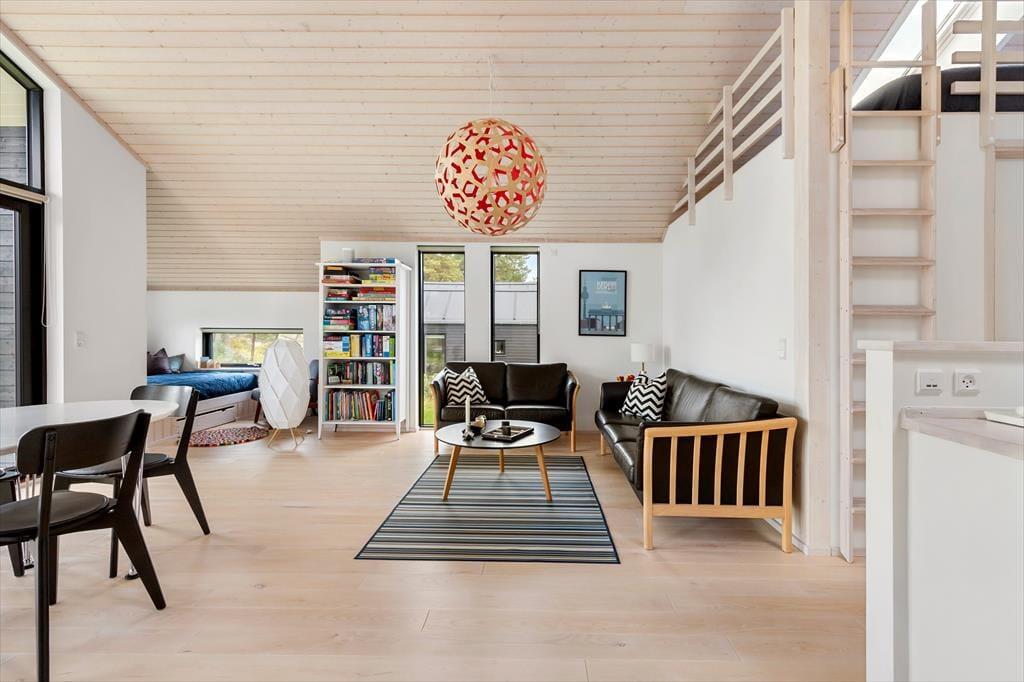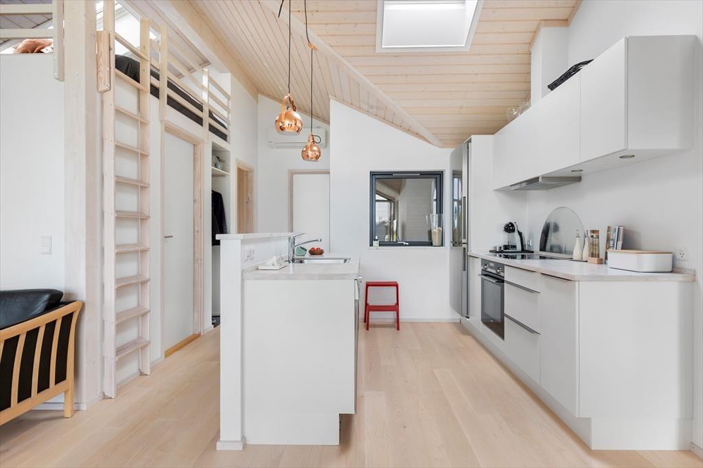 Sommerhusets hjerte er den store, åbne stue med loft til kip og brede vinduespartier, der lukker lyset ind og giver frit udsyn til haven. Her kan du følge med i livet udenfor, mens du nyder en kop kaffe ved spisebordet eller samler familien til hyggelige måltider. Køkkenet ligger i åben forbindelse med stuen, så madlavningen kan foregå side om side med samtaler og brætspil.