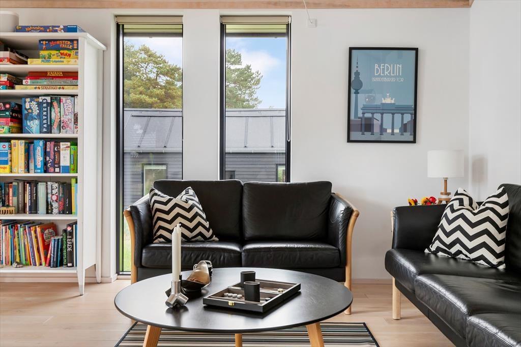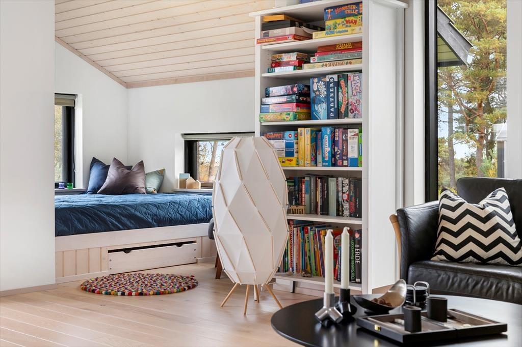Indretningen er moderne og enkel med farverige detaljer, der giver rummet karakter. Alkoven i hjørnet af stuen skaber en ekstra hyggekrog og kan samtidig bruges som ekstra soveplads.