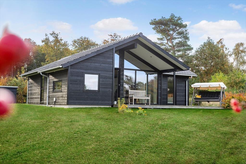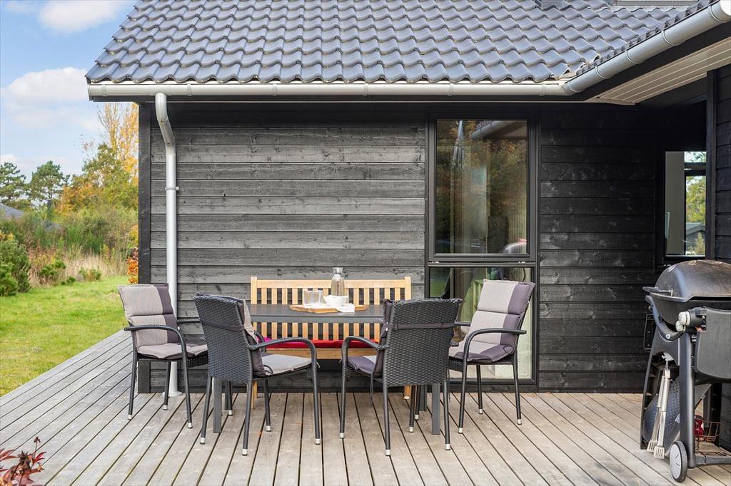 Sommerhuset ligger på en stor, grøn grund, hvor der er god plads til leg, afslapning og udeliv. Der er terrasser på begge sider af huset, så du kan nyde solen hele dagen – fra den første morgenkaffe til aftensmaden på grillen. På den overdækkede del af terrassen kan du sidde i læ og stadig nyde naturen omkring dig, mens børnene leger i haven.