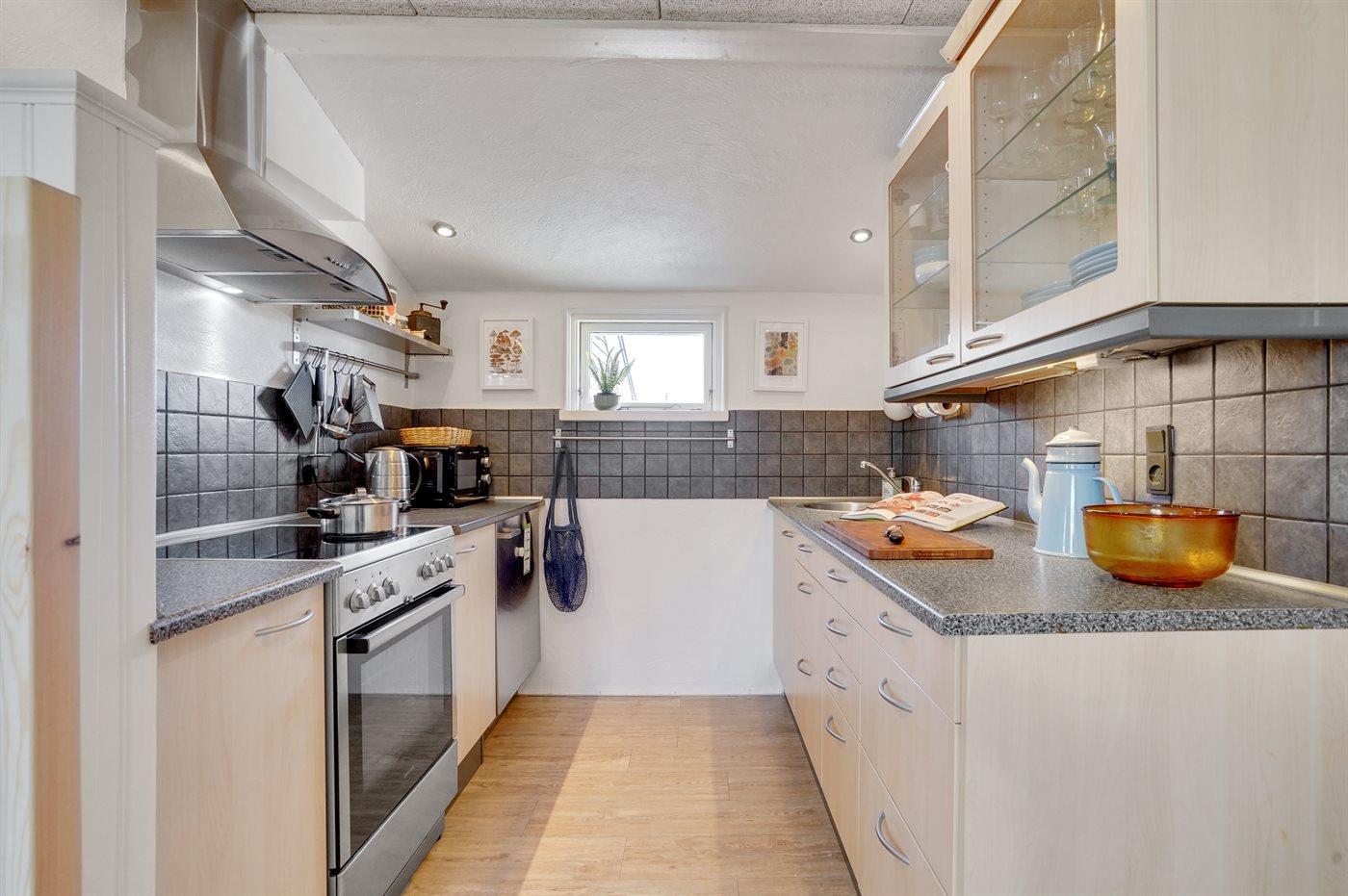 Køkkenet er udstyret med 1 køleskab. Der er 4 keramiske kogeplader, varmluftovn, mikrobølgeovn.
