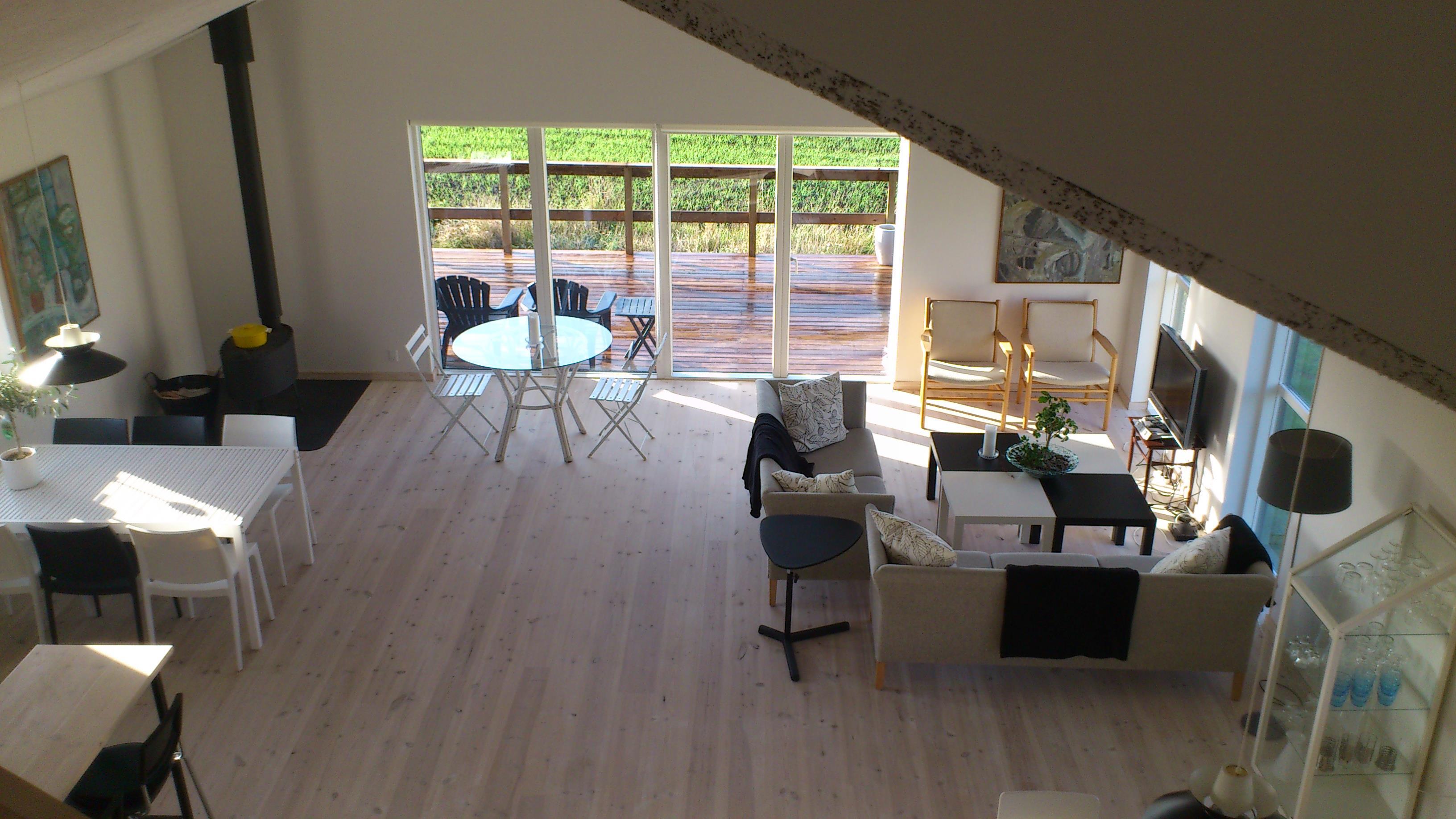 Stort kombineret køkken, spise- og opholdsstue med udsigt ud over landskabet. Trådløst internet. Mulighed for at leje "Sleepin" for 2 - 3 pers, i sommerperioden. Adgang til køkken og bad. Pris: DKK 250,- pr. pers. / nat.