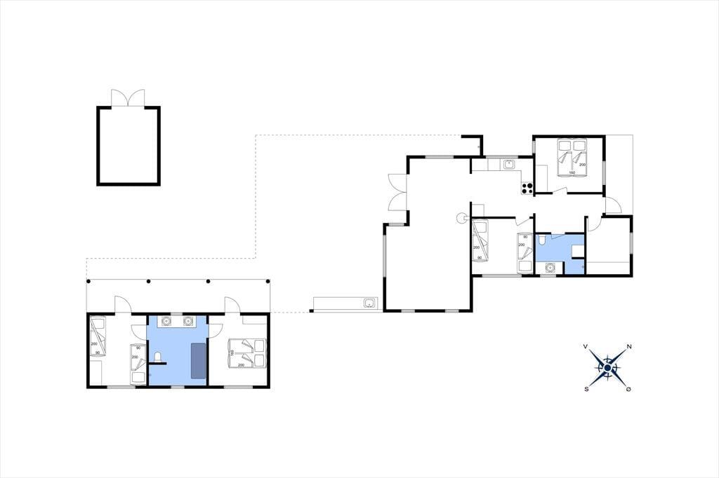 Sommerhuset består af et hovedhus og et anneks, forbundet af en rummelig træterrasse, der indbyder til udendørs ophold. I hovedhuset finder du et åbent køkken i forbindelse med en opholds- og spisestue, hvor vinduerne lader dagslyset strømme ind og skaber en hyggelig atmosfære. Efter en dag fuld af oplevelser kan du nyde et afslappende bad i husets badeværelse, som også er udstyret med vaskemaskine og tørretumbler for din bekvemmelighed. De to soveværelser i hovedhuset tilbyder komfortable sovepladser; det ene med en dobbeltseng og det andet med en enkeltseng samt en køjeseng, hvor kun den nederste køje er beregnet til brug.