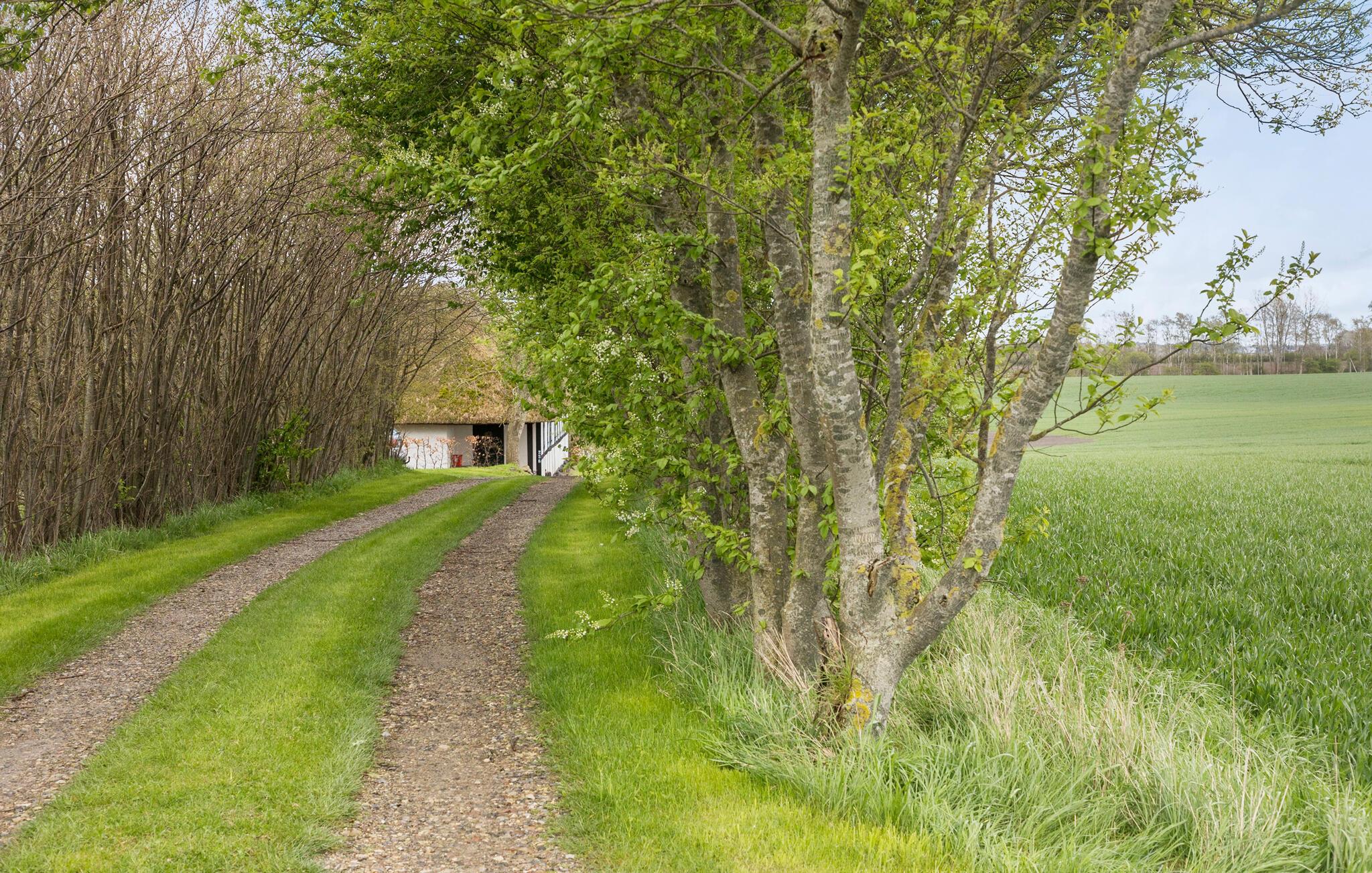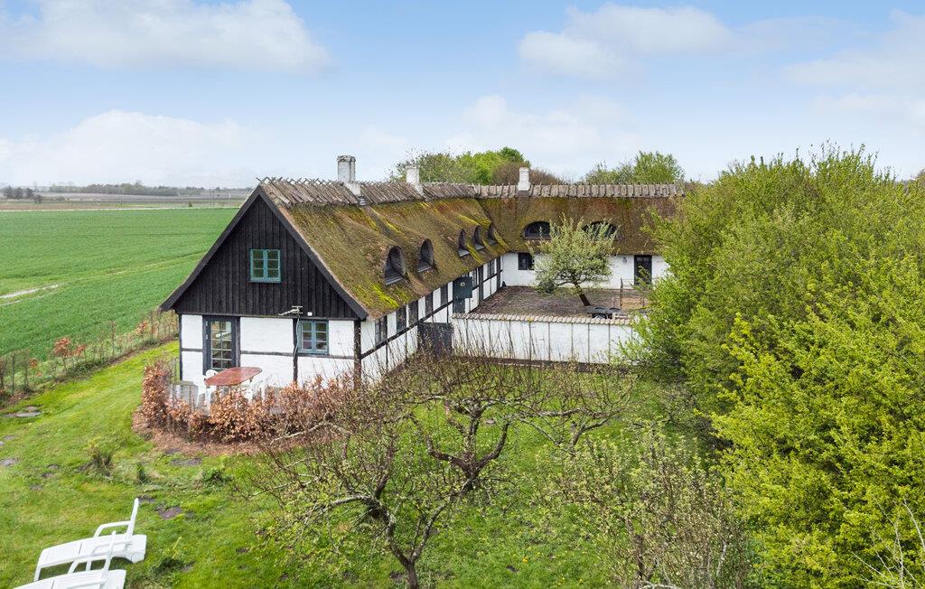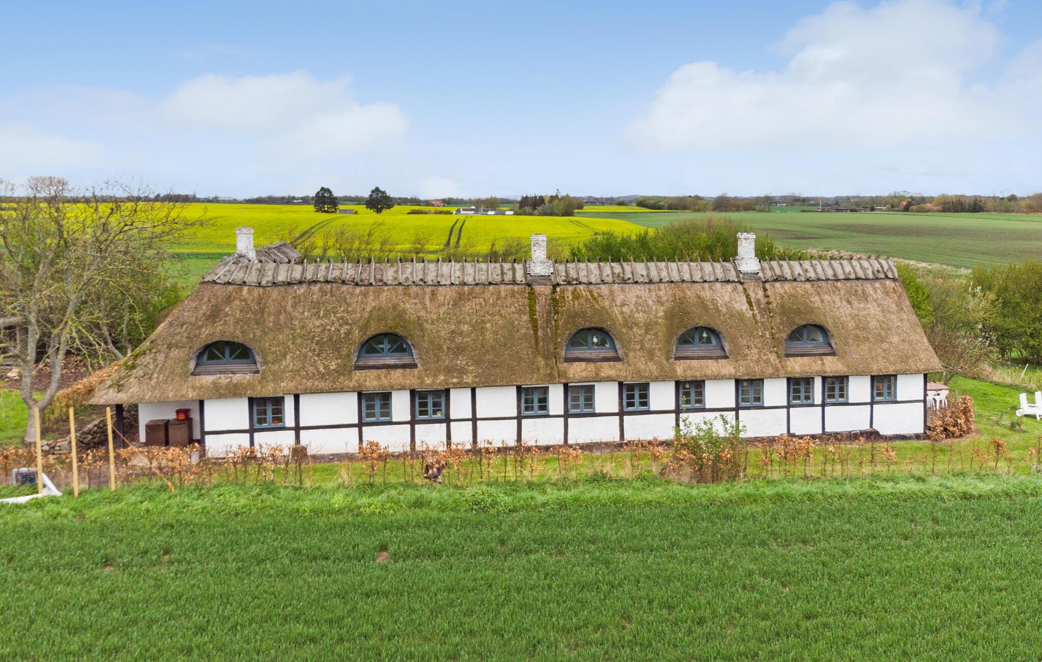 Stort landsted med stråtag og panoramaudsigt tæt på Skaverup Strand, ideelt til familieferie.