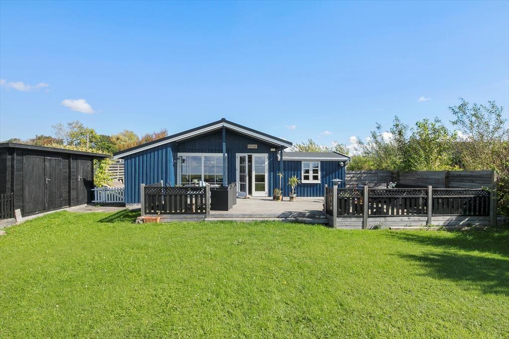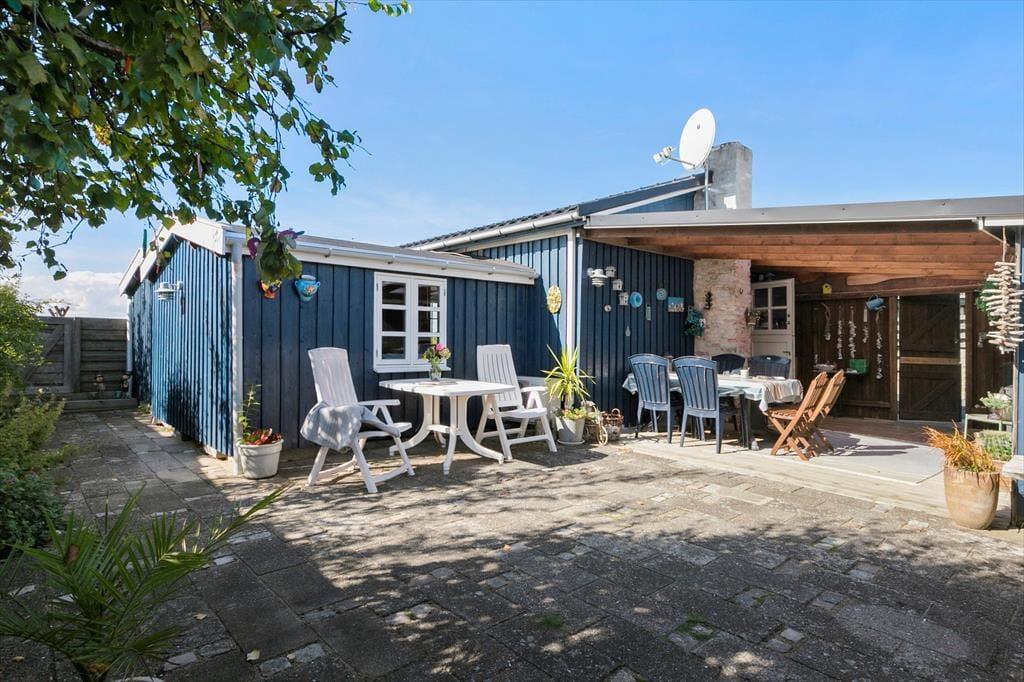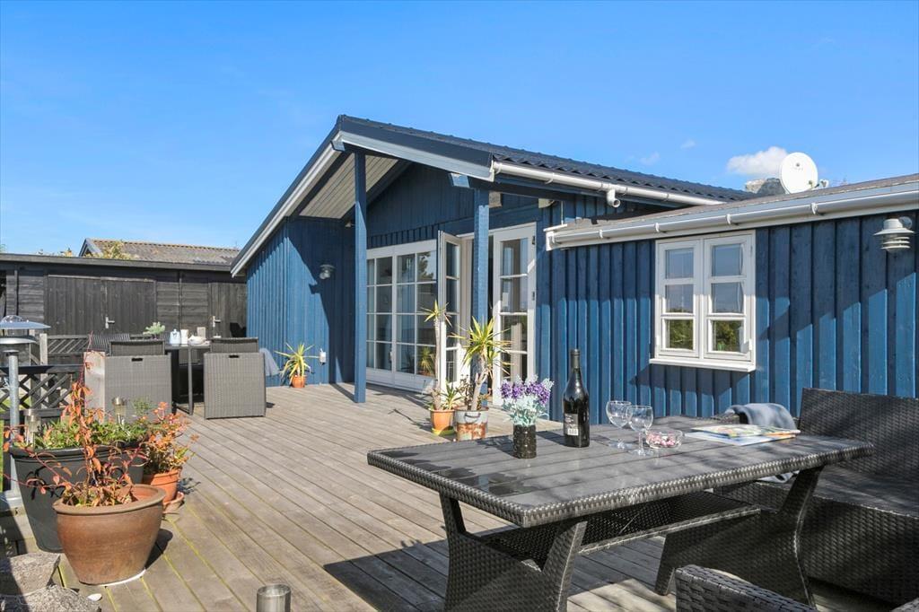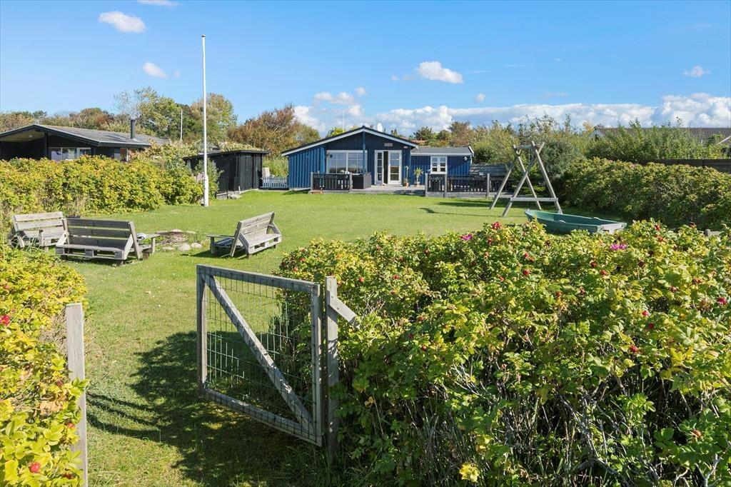 Huset har en 740 m2 grund som går helt ud til strandarealet ved Næsby Strand. Der er en skøn terrasse med havudsigt hvor man kan nyde solen i fulde drag og om aftenen fordybe sig i den smukke solnedgang, samt en delvis overdækket terrasse hvor man kan søge ly og læ. Dette inviterer til total afslapning. Ved feriehuset er der havemøbler, grill, parasol og bålsted