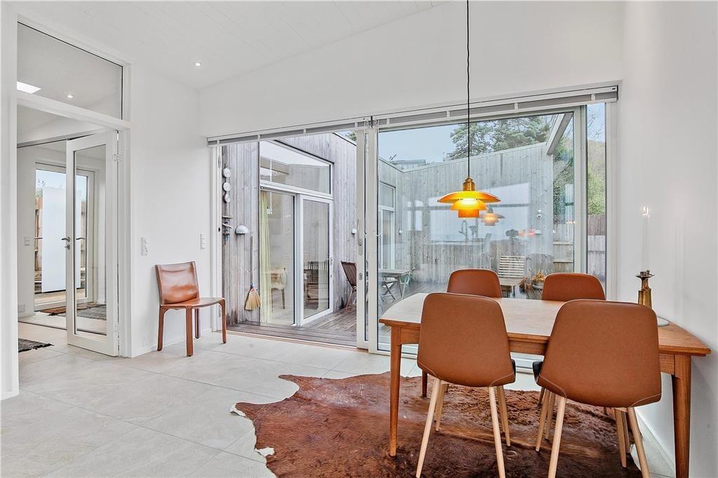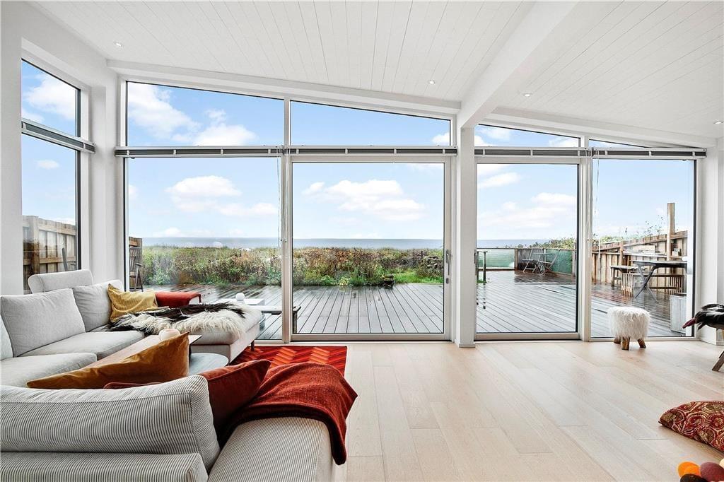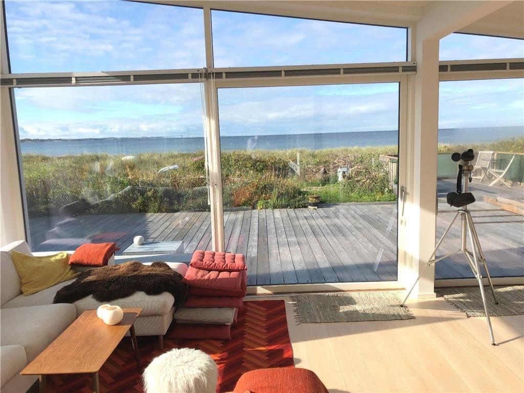 Nyt arkitekttegnet sommerhus fra 2018 opført i en moderne arkitektur med en intim og hyggelig sommerhusatmosfære og en gennemtænkt indretning. Huset byder på en helt fantastisk havudsigt. Indretningen er enkel og overskuelig og samler sig om den centralt placerede stue med de store panoramavinduer. Huset indeholder en stor opholdsstue på 53 m3 med køkken/alrum. Åbent køkken med indbygget ovn, keramiske kogeplader, mikroovn, opvaskemaskine og køleskab med fryser. Stor lys opholdsstue med udgang til terrasse, loft til kip, hyggelig spisekrog, brændeovn, stor hjørnesofa med Chaiselong og TV. Entre med vaskemaskine og tørretumbler. 2 Badeværelser, begge med brusenicher (det ene befinder sig i et anneks). Tre soveværelser, et i huset med 1 dobbeltseng og to i et 26 m3 anneks, hvor der er dobbeltenge og en bred overkøje på 140x200 i begge. Opvarmning af huset foregår via luft til vand varmepumpe med gulvvarme i det meste af huset, samt brændeovn i opholdsstuen.