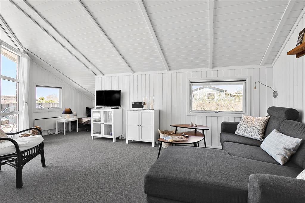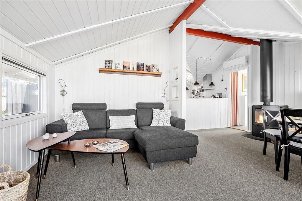 Lækkert lyst nyrenoveret feriehus med loft til kip i næsten alle rum. Feriehuset er indrettet med kombineret køkken og opholdsstue. Lyst køkken med indbygget ovn, kogeplader, opvaskemaskine, mikroovn og køleskab med fryser. Dejlig lys opholdsstue med et godt lysindfald via store vinduespartier. Udgang til terrassen, brændeovn, god og hyggelig spiseplads, sofa og lænestole, TV med youSee tv-pakke. Badeværelse med bruseniche, gulvvarme og vaskemaskine. 3 soveværelser, alle med dobbeltsenge. I stuen er der desuden en alkove med 2 sovepladser. Anneks med dobbelt sovesofa. Huset opvarmes med varmepumpe, brændeovn og elvarme.