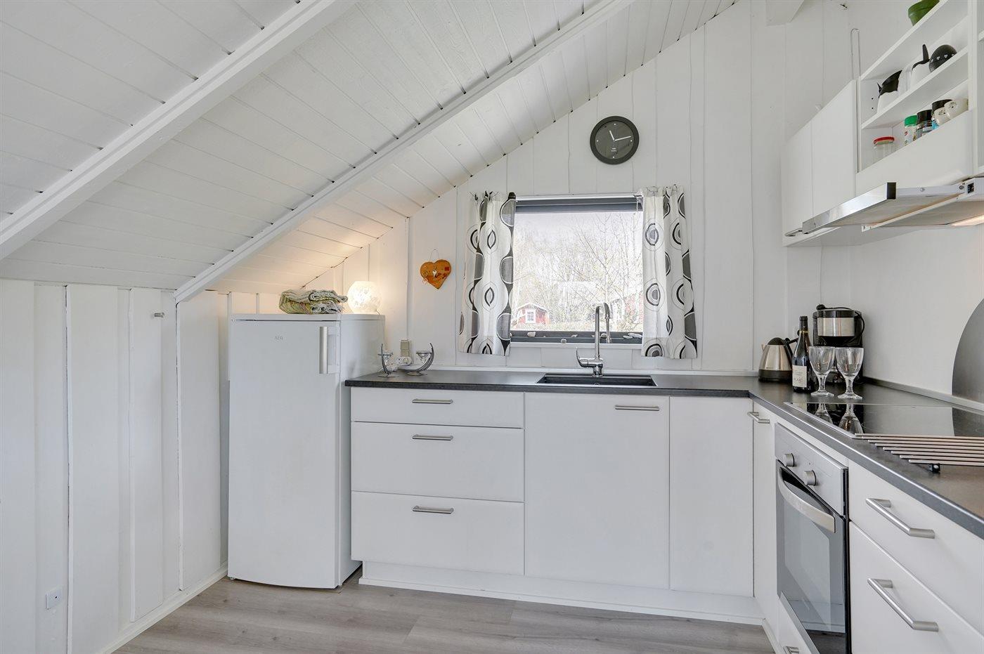 Køkkenet er udstyret med 1 køleskab. Der er 4 keramiske kogeplader, varmluftovn, mikrobølgeovn.