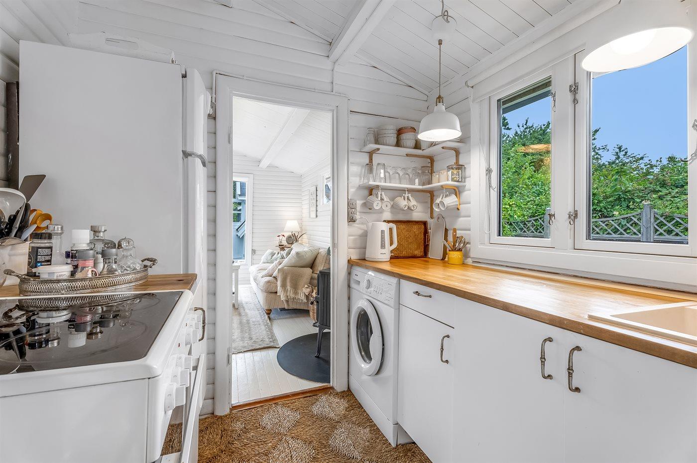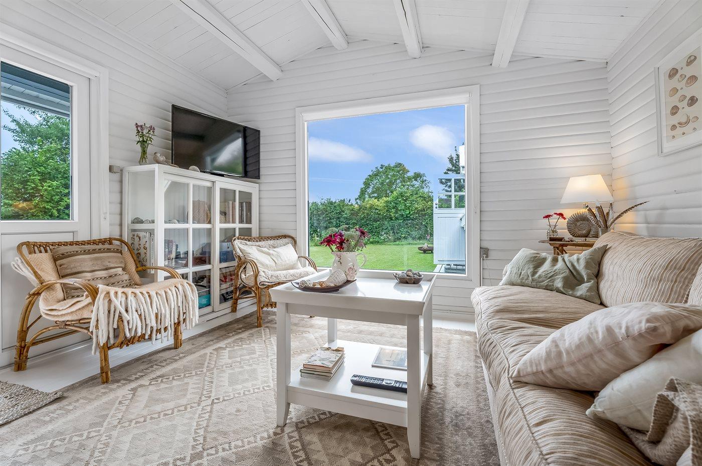 Huset er intimt og hyggeligt indrettet med køkken, et lille gæstetoilet (uden bruser), et soveværelse og en lys stue med et stort panoramavindue med udsigt til den skønne have. På bagsiden af huset finder I udendørsbruseren, hvor I kan nyde de varme vandstråler efter en dukkert i Østersøen.