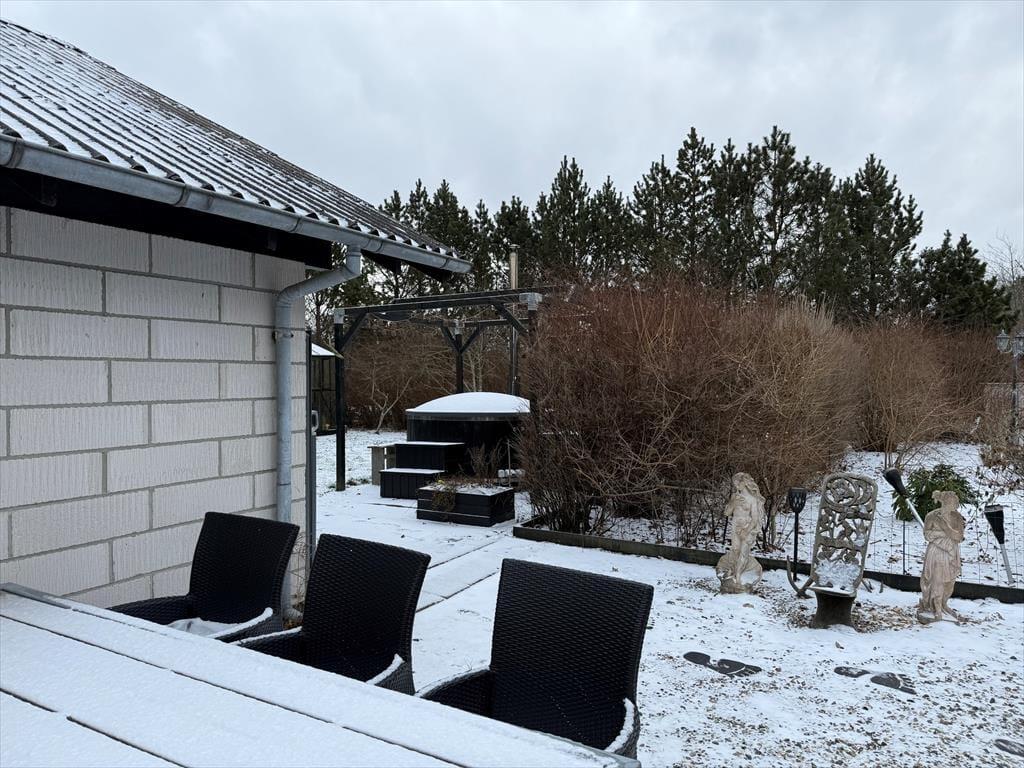 Udelivet er en helt naturlig del af ferien her. Den overdækkede terrasse, som ligger mellem hus og carport, er næsten husets bedste rum og kan bruges det meste af året. Her kan I sidde i læ og nyde morgenkaffen, lange måltider eller en rolig stund, selv når vejret er mere omskifteligt.