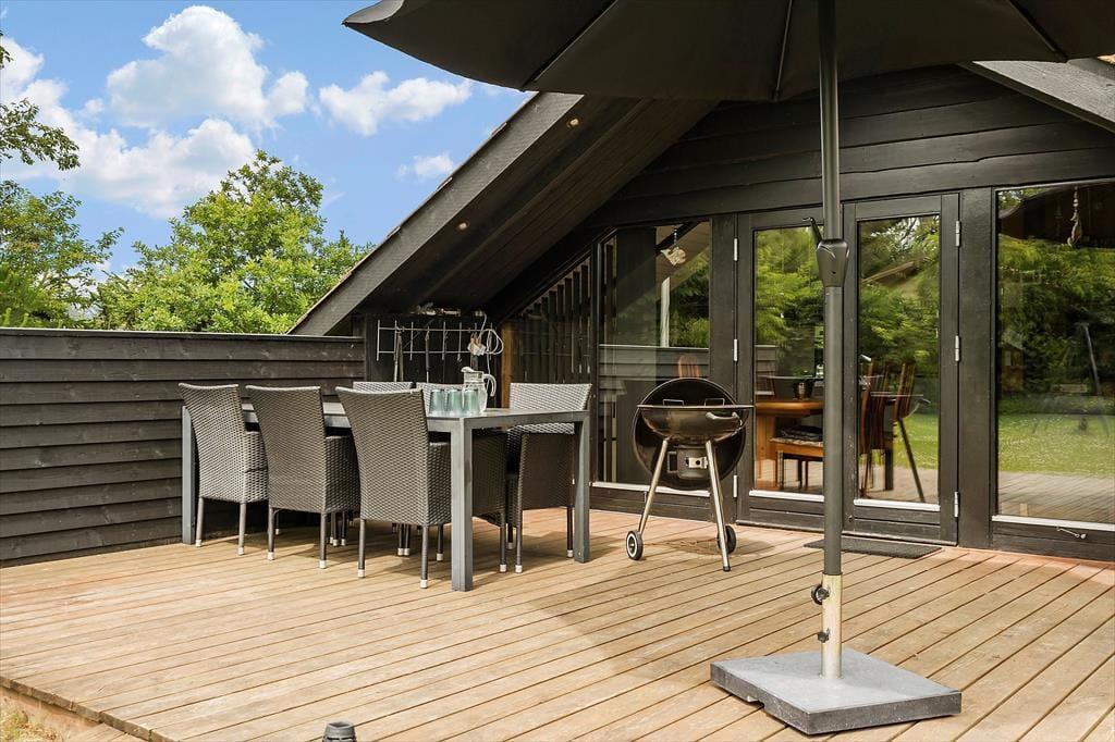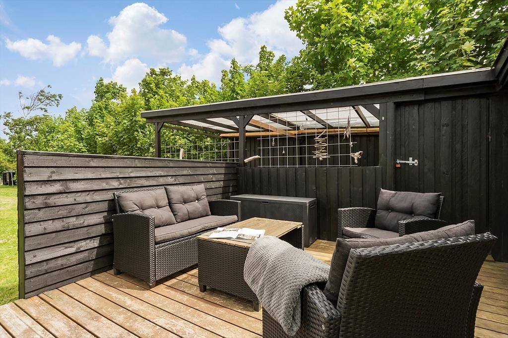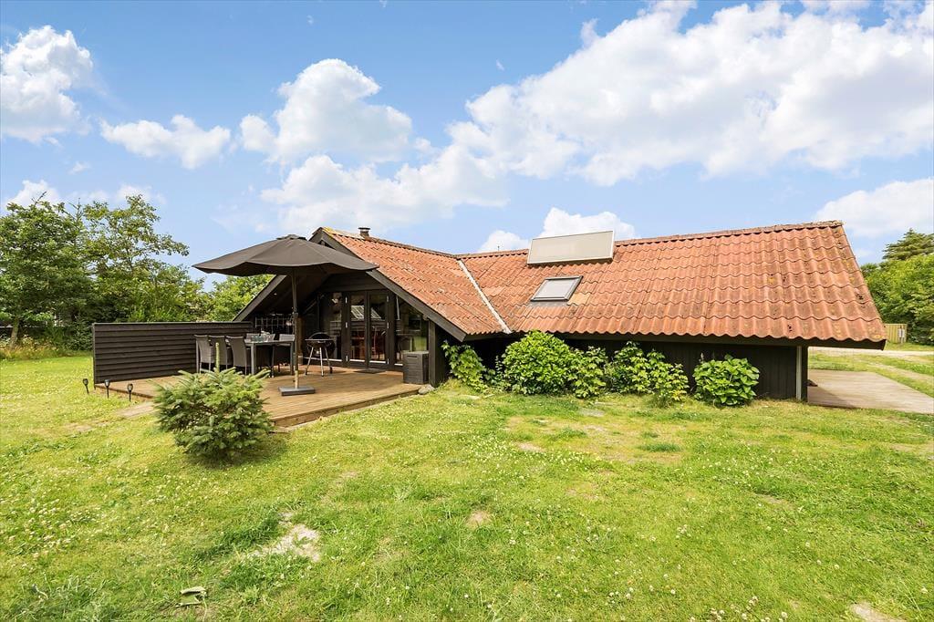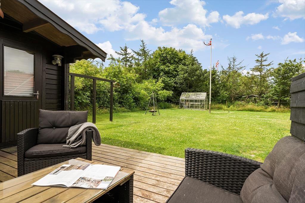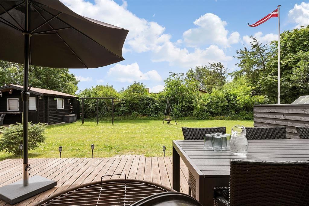 Når I ankommer, vil i med det samme kunne mærke at roen sænker sig over jer på den ugenerede grund, der er omkranset af træer og buske. Nyd solen fra morgen til aften på husets to terrasser, som garanterer jer et dejligt sted at slappe af og nyde hinanden selskab og lyt til fuglene der kvidrer. Den store græsplæne indbyder til leg og spil for både store og små, så det er kun fantasien der sætter grænser. På den lille hyggelige bålplads er der rig mulighed for at sidde f.eks. bage snobrød eller få varmen en kølig dag eller aften.