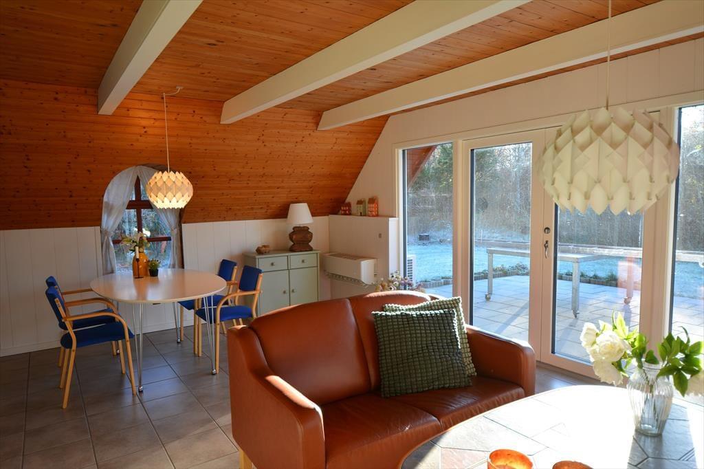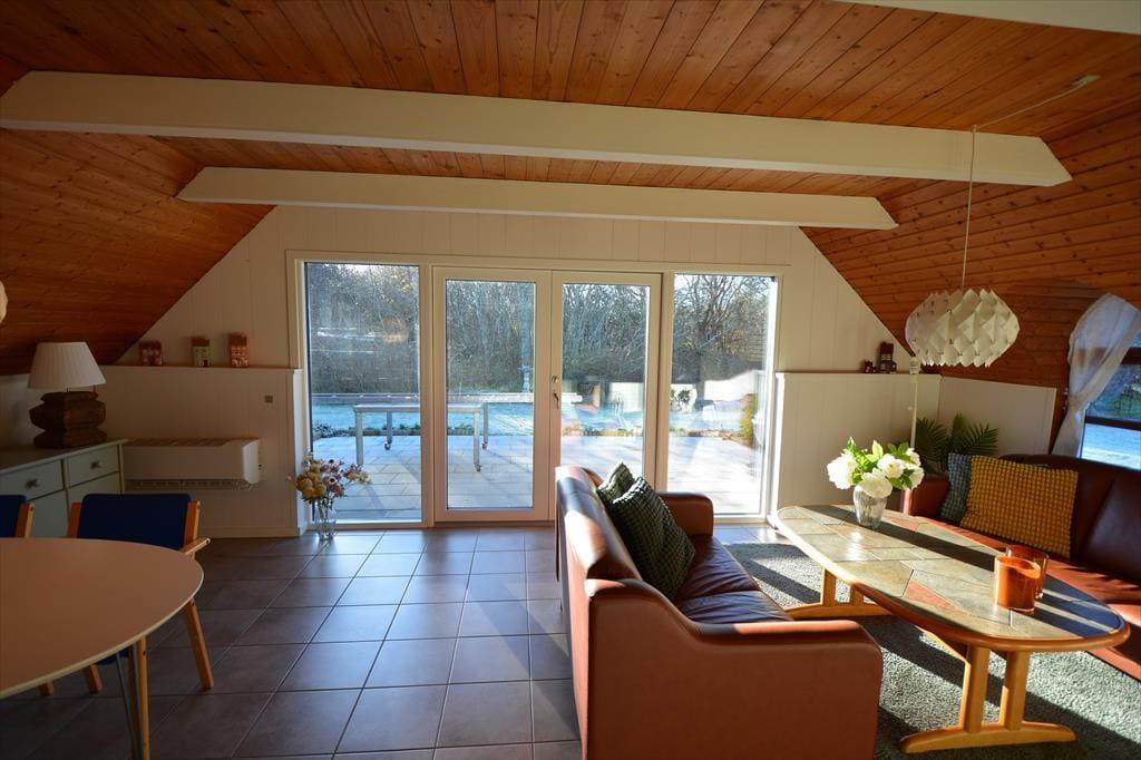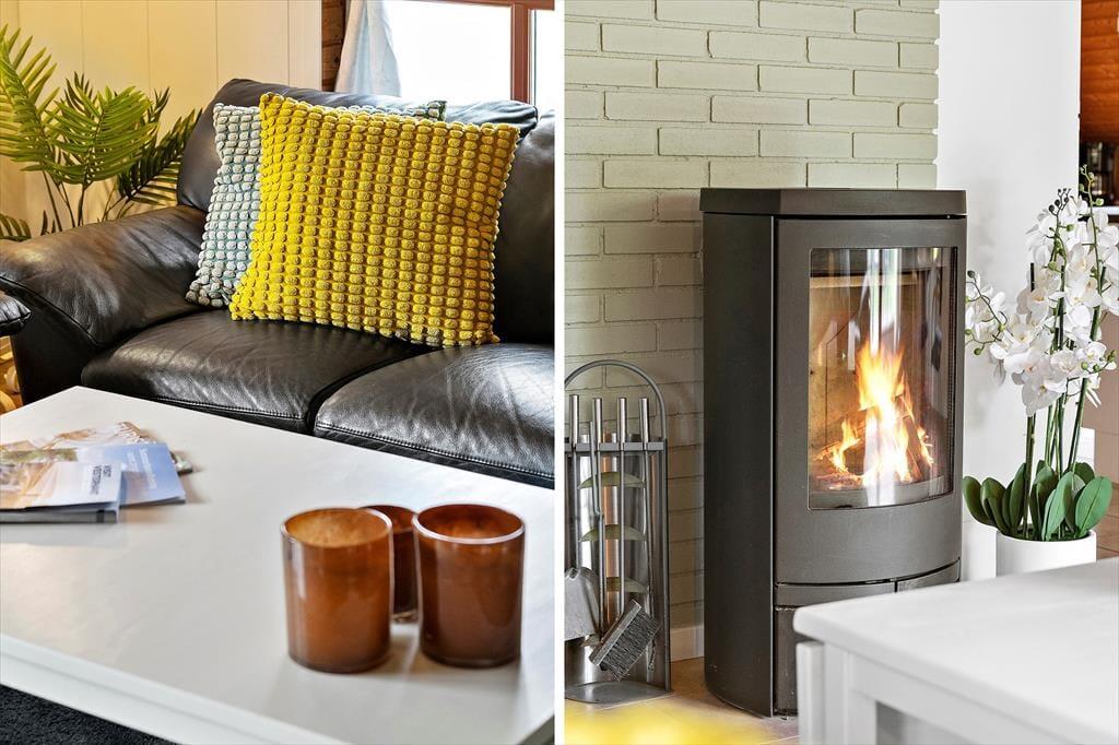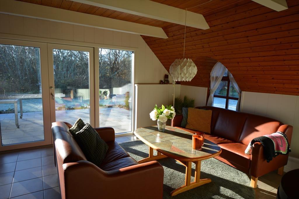Indenfor finder I en hyggelig stue med komfortable møbler, brændeovn og masser af plads til samvær. Her kan I nyde en stille stund med en god bog, en kop kaffe eller bare lade blikket hvile ud over haven gennem de store vinduer. Brændeovnen spreder en behagelig varme, som giver ekstra hygge på kølige dage og aftener – og bidrager til den særlige stemning, der gør huset til noget helt særligt.