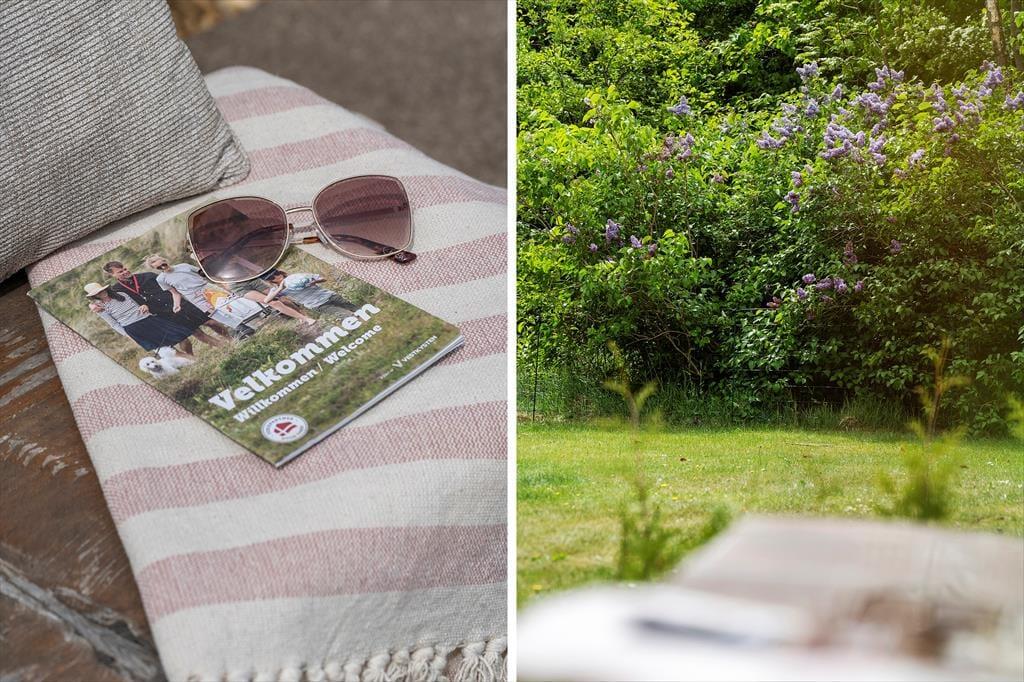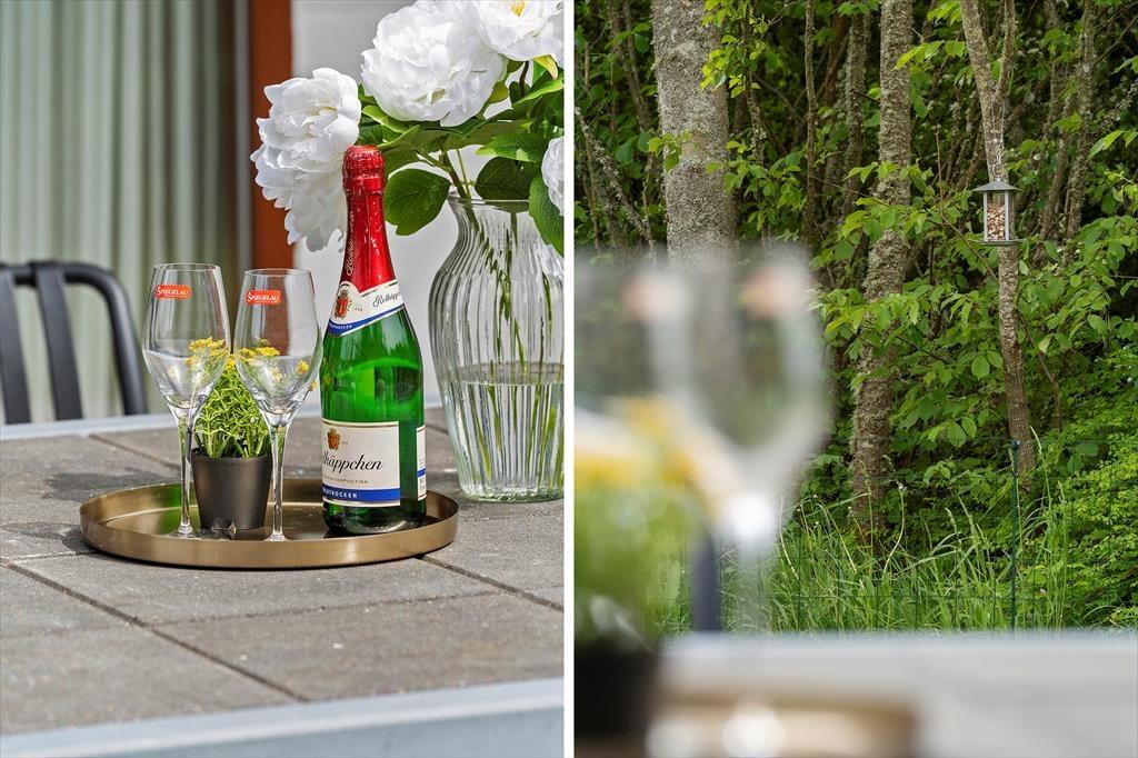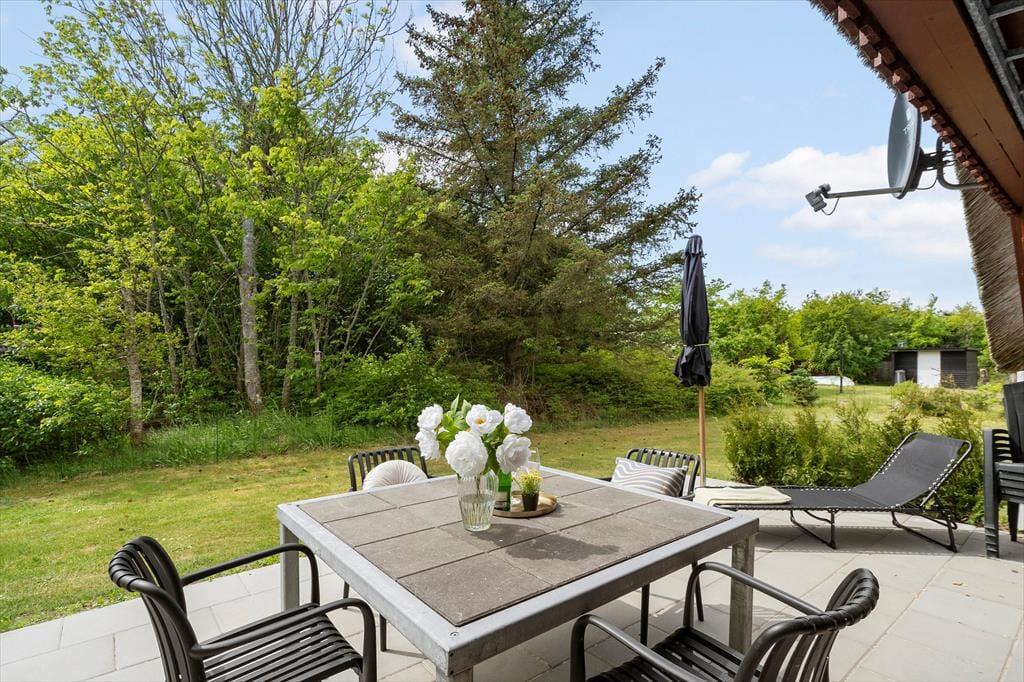 Udenfor venter en stor og dejlig have, delvist omkranset af træer, som giver både læ og privatliv. Den sydvendte terrasse er det perfekte sted at starte dagen med morgenmad i solen eller nyde eftermiddagens solen på terrassen. Her kan I læne jer tilbage i havemøblerne med en bog, et glas vin eller bare lytte til fuglene og mærke naturens nærvær.