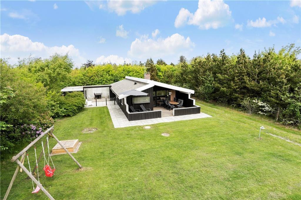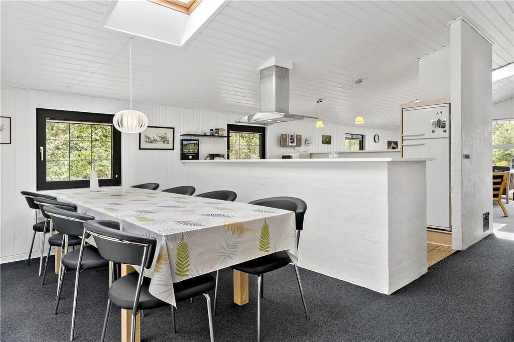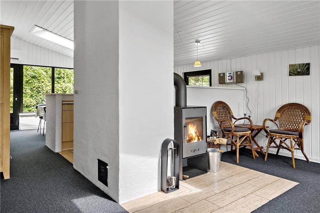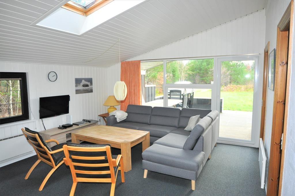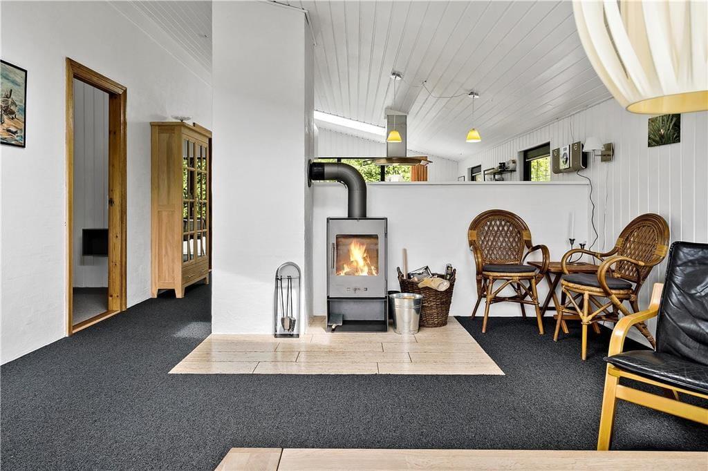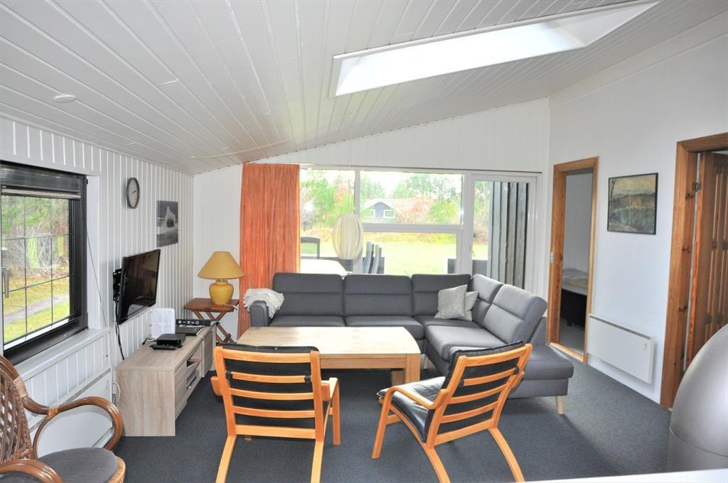 Hyggeligt lyst træferiehus hvor I hurtigt vil kunne skabe den perfekte feriestemning, I kan tage hele familien med, og her er plads til jer alle sammen. Efter en lang dag med en masse aktiviteter kan I smide benene op i sofaen, og skabe en hjemme biograf. I kan have kontakt til hele familien i hele huset, fra halvmuren i køkkenet. Tænd op i brændeovnen når I har brug for ekstra hygge, eller kulden bevæger sig indenfor, og nyd udsigten til de skønne flammer, og varmen der bevæger sig rundt i huset.