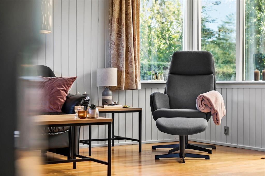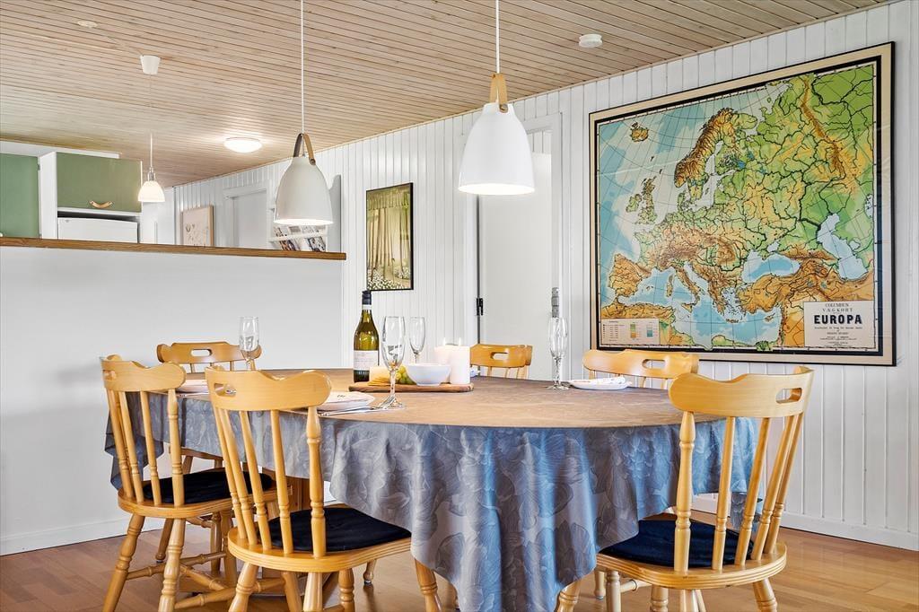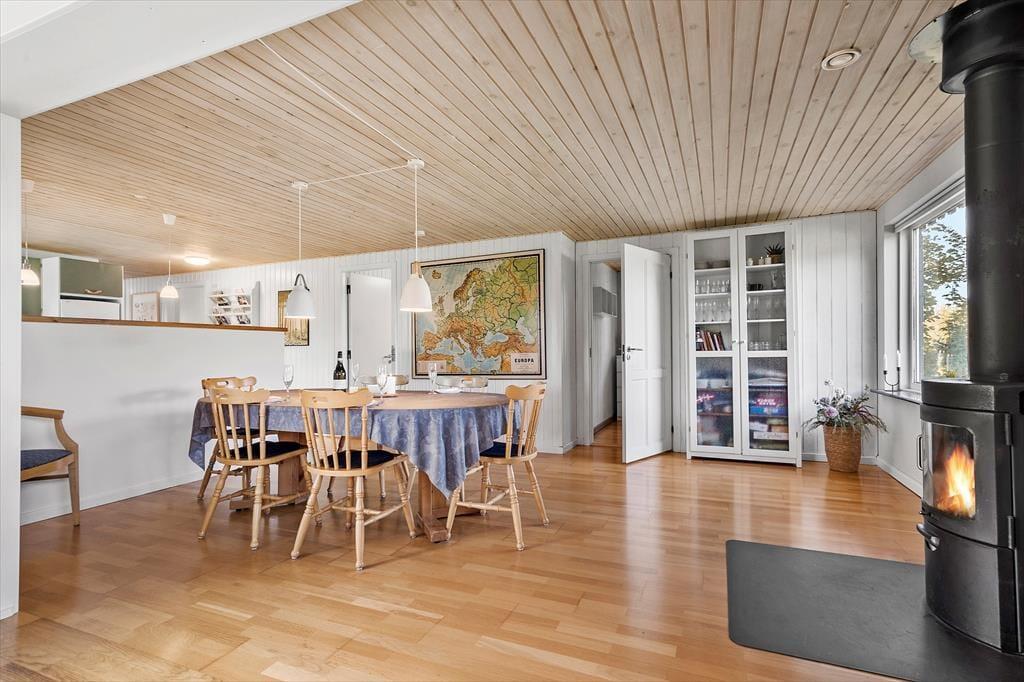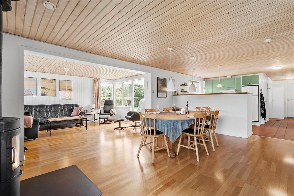 Sommerhuset er godt indrettet, lyst og venligt med et åbent køkken i direkte forbindelse til stuen, hvilket skaber en hyggelig og nærværende atmosfære. Her er der plads til samvær, uanset om der tilberedes mad eller hygges i stuen.
