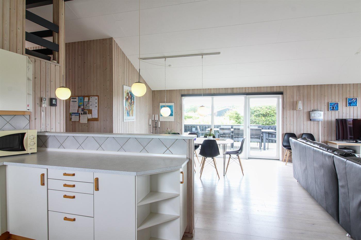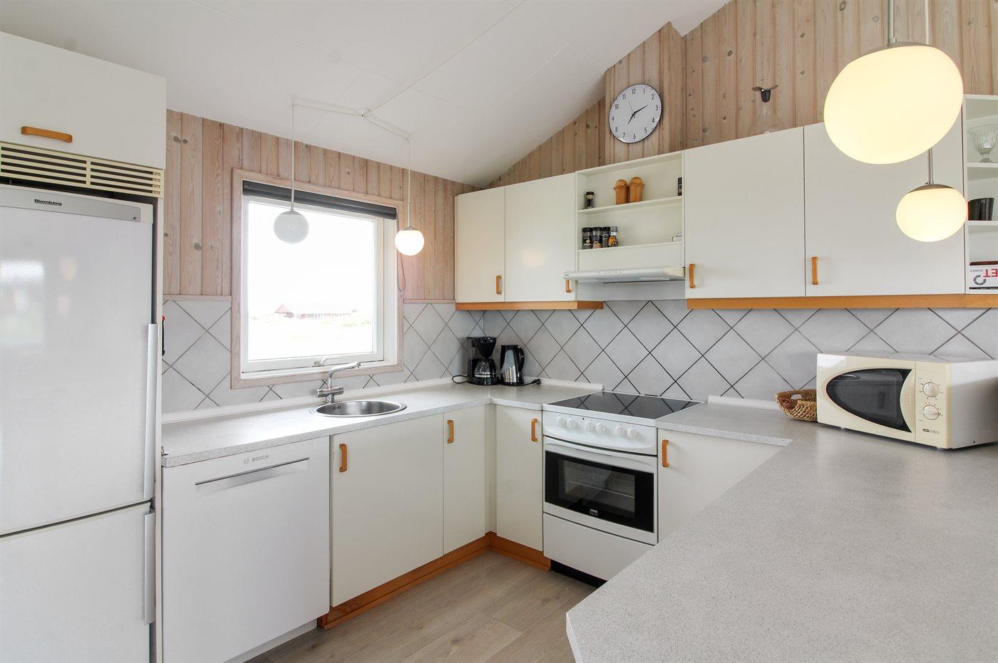 Køkkenet er udstyret med 1 køleskab. Der er 4 elkogeplader, bageovn, mikrobølgeovn samt opvaskemaskine.