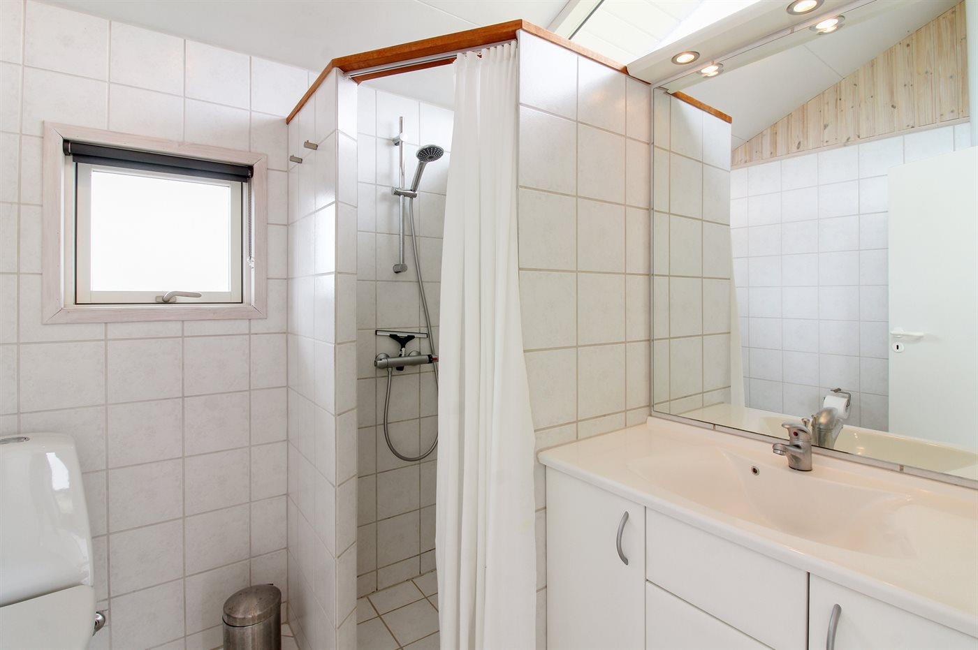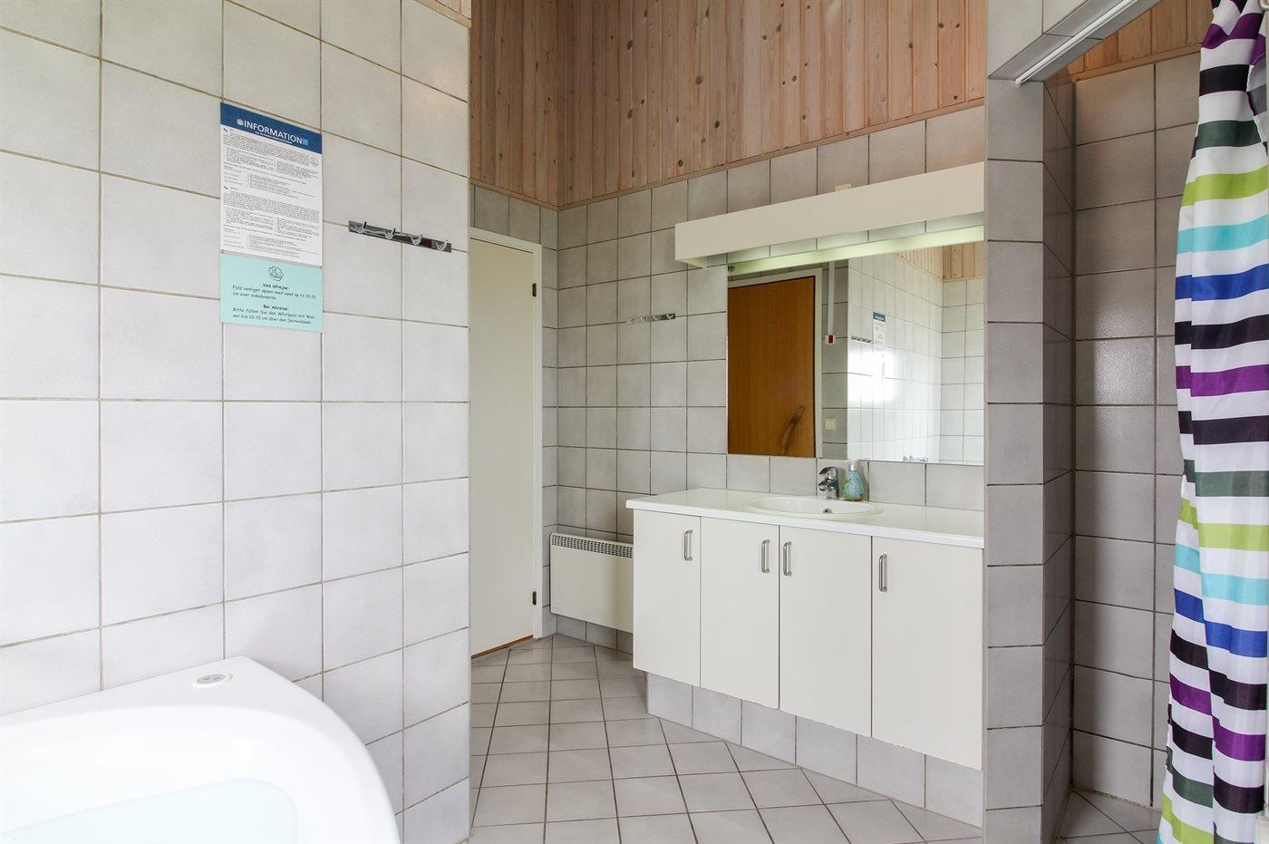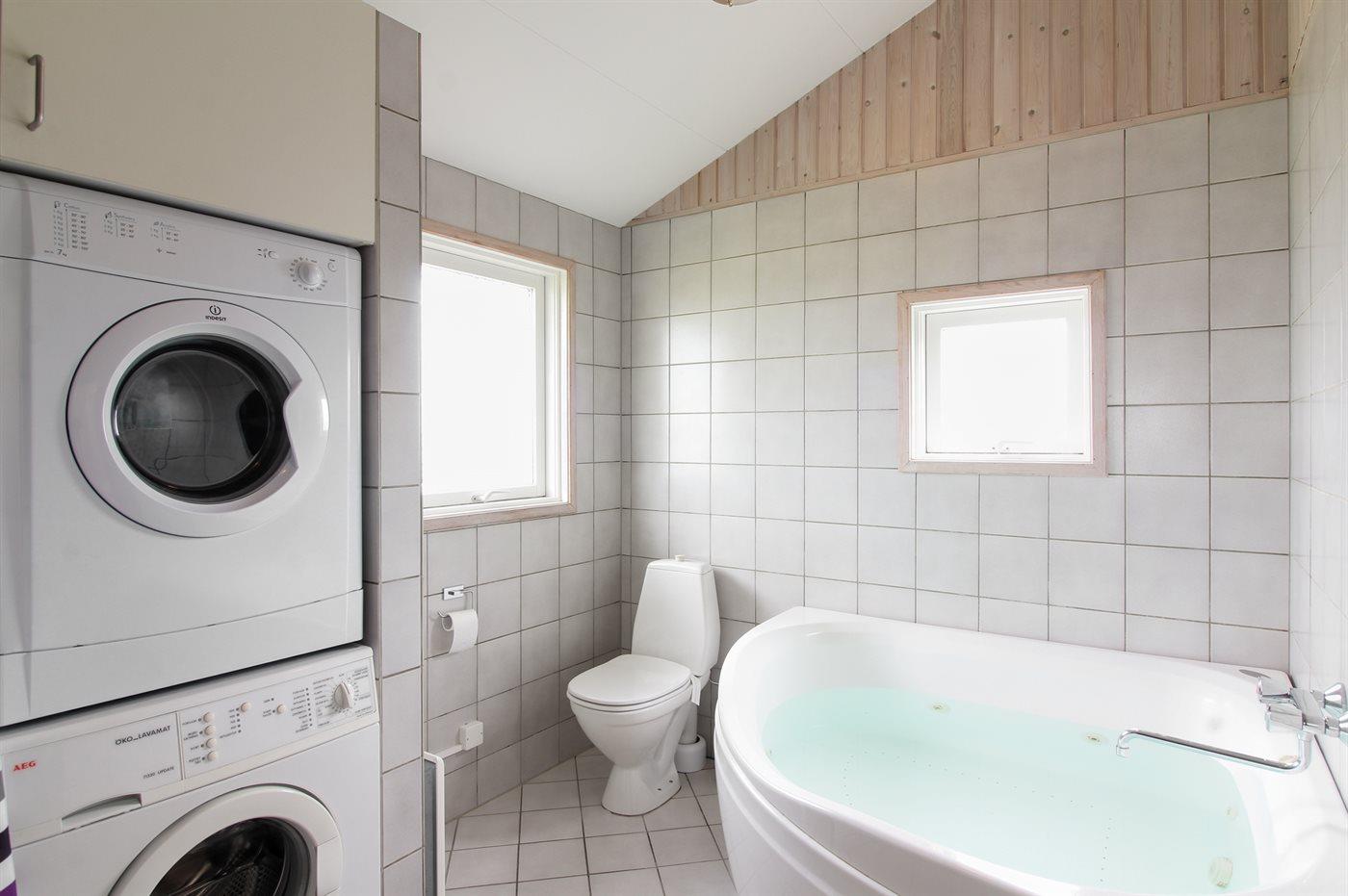 Der er 2 badeværelser med bruseniche og 2 toiletter. Der er gulvvarme på 1 badeværelse. I saunaen er der mulighed for afslapning.