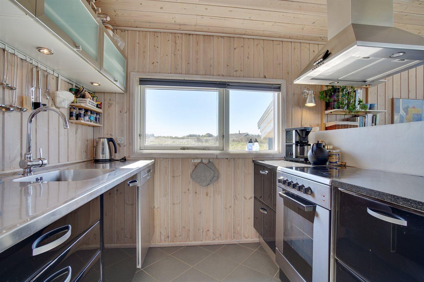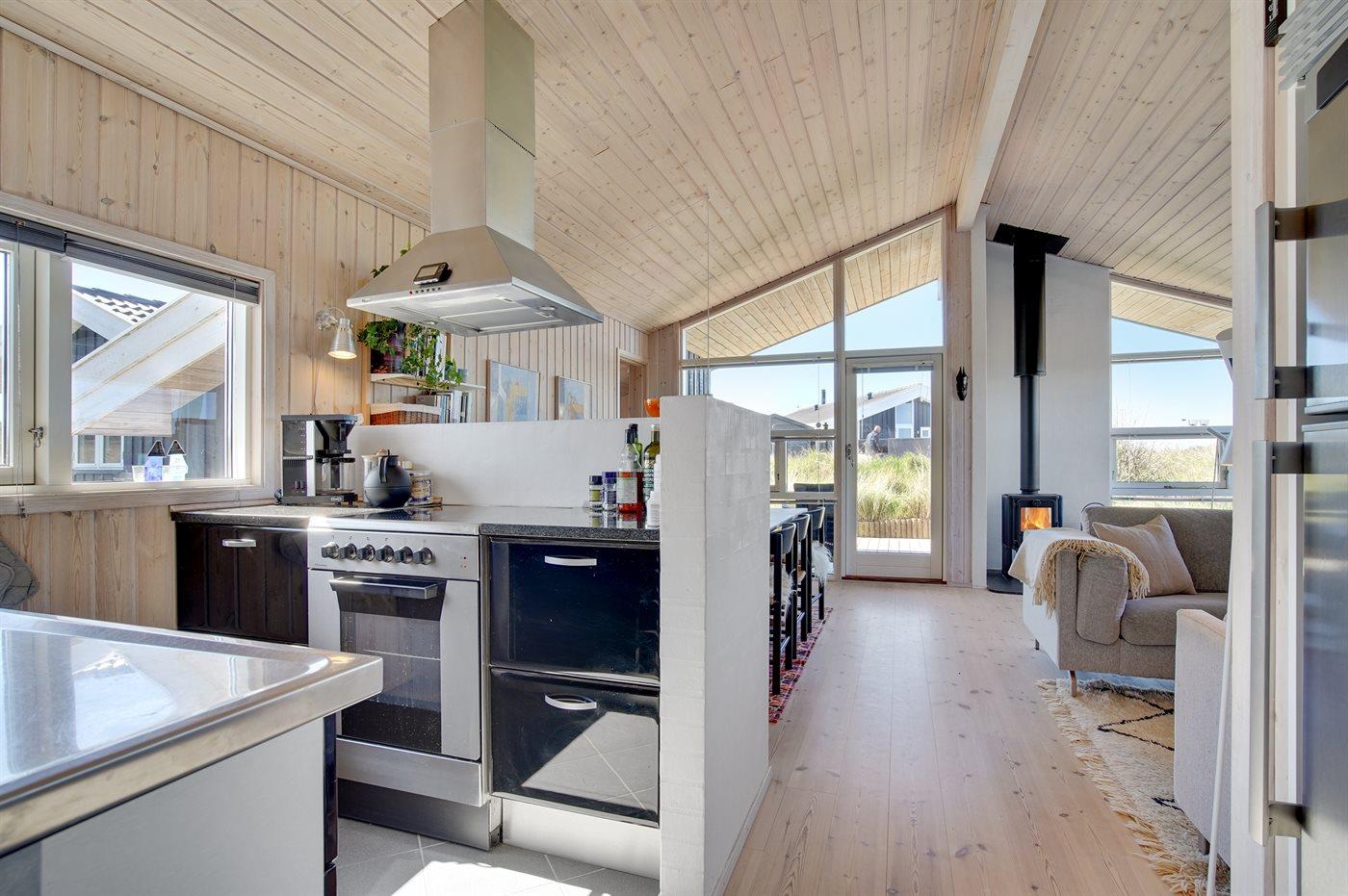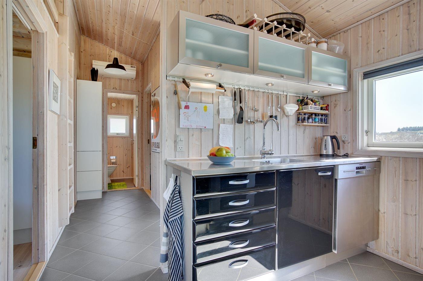 Køkkenet er udstyret med 1 køleskab. Der er 4 keramiske kogeplader, varmluftovn, mikrobølgeovn samt opvaskemaskine Der er gulvvarme i køkkenet.