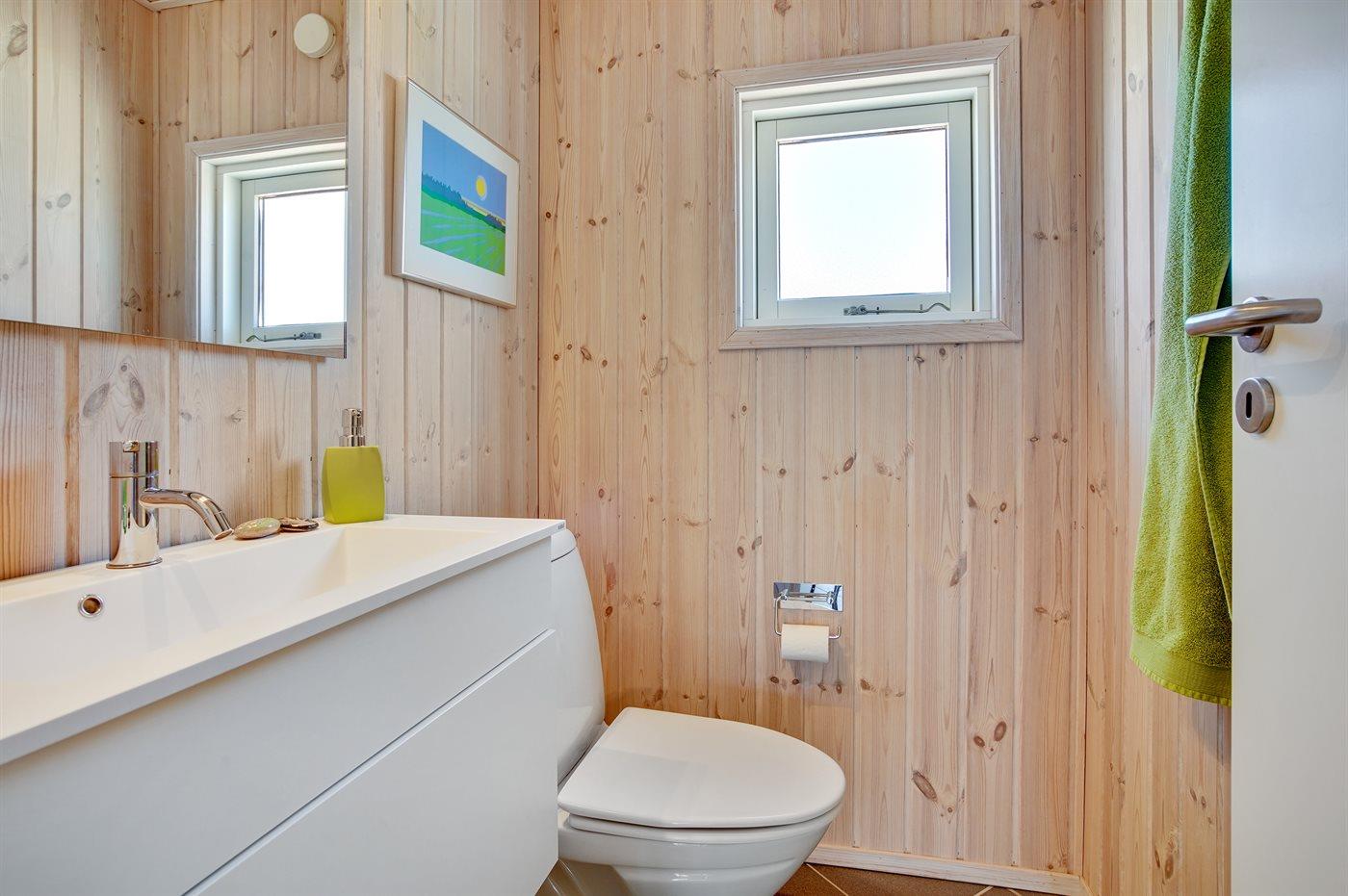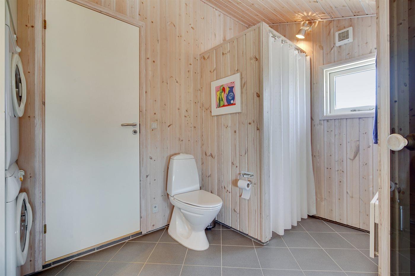 Der er 1 badeværelse med bruser og 2 toiletter, heraf 1 gæstetoilet. Der er gulvvarme på 1 badeværelse. I saunaen er der mulighed for afslapning.