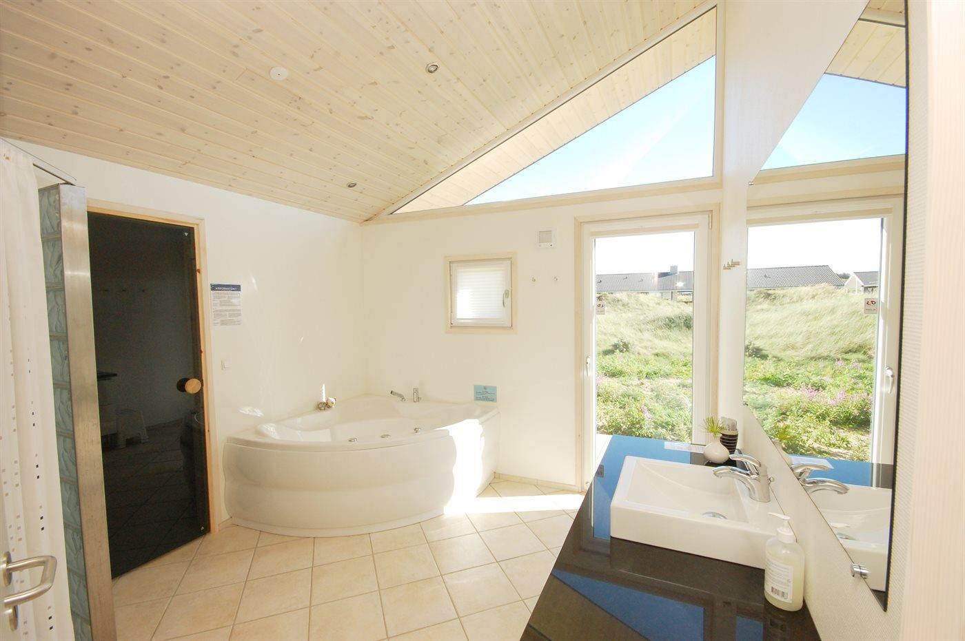 Der er 2 badeværelser med bruseniche og 2 toiletter. Der er gulvvarme på 2 badeværelser. I saunaen er der mulighed for afslapning.