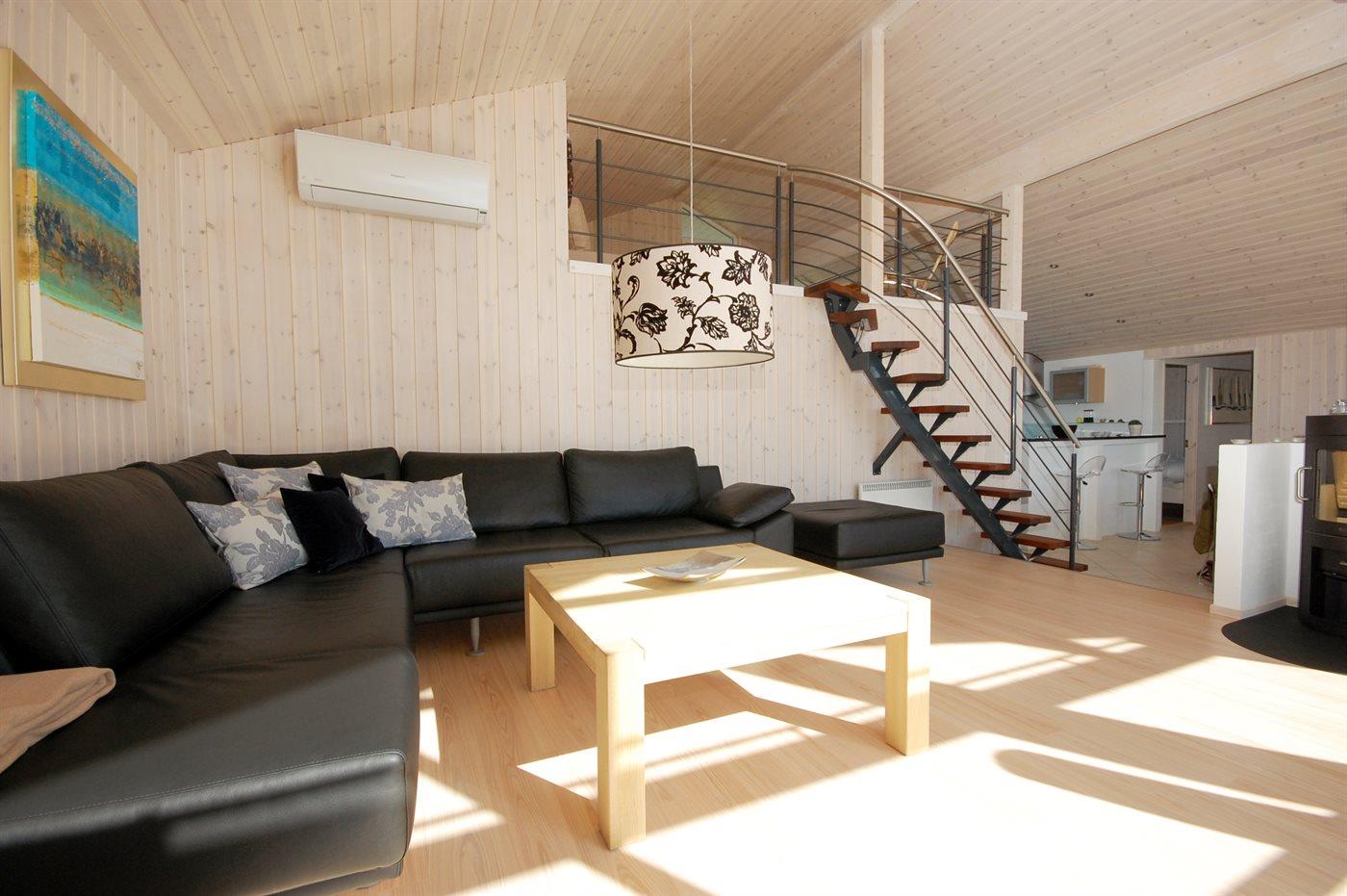 Eksklusivt, arkitekttegnet og allergivenligt sommerhus beliggende tæt på god og meget børnevenlig badestrand. Huset er helårsisoleret og udstyret med varmepumpe/aircondition, hvilket reducerer varmeudgiften og forbedrer indeklimaet. I husets centrum er der opført en hems på søjler. Hemsen er opdelt i en soveafdeling med 2 sovepladser samt en legeafdeling.
