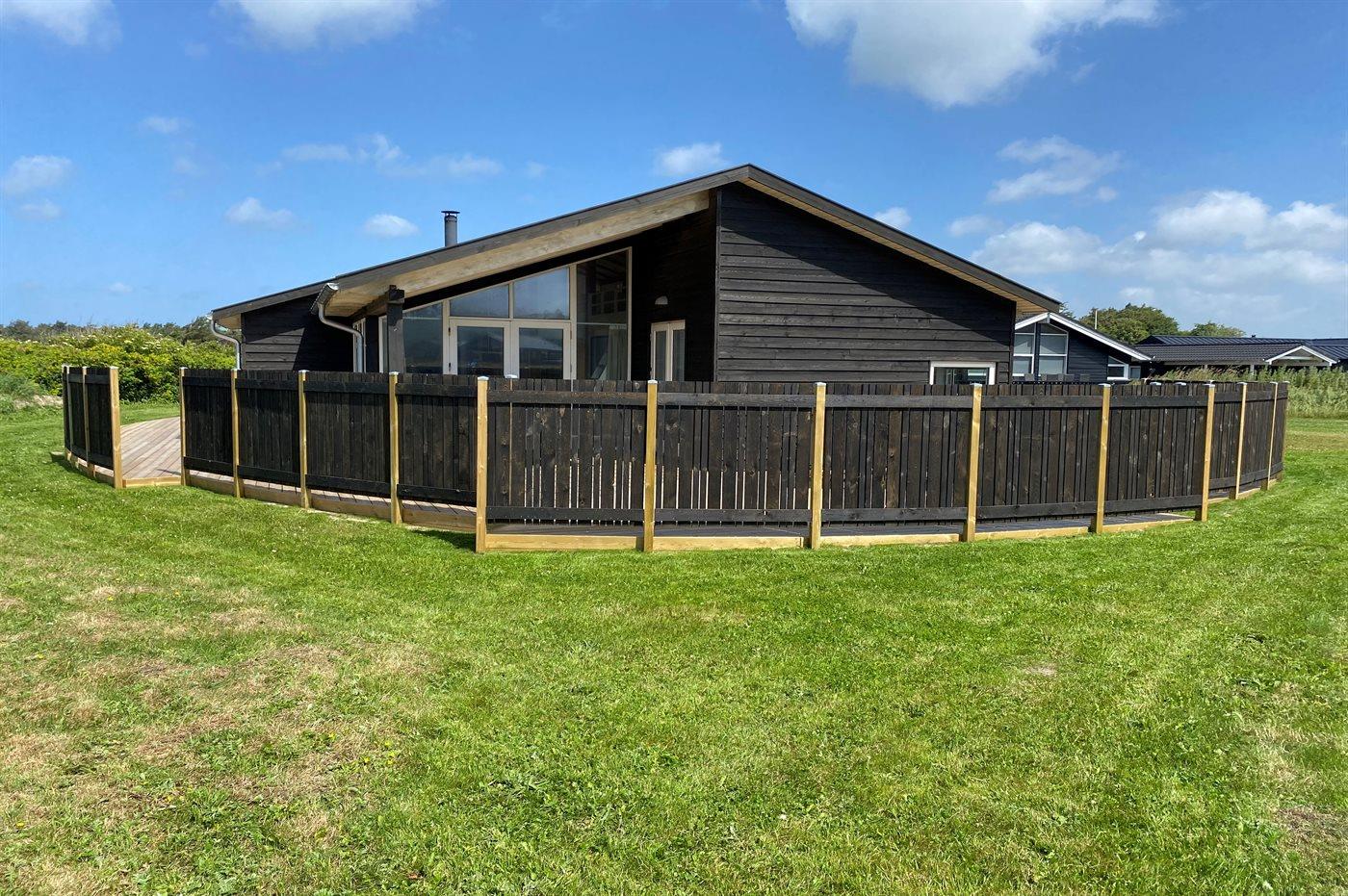 Lyst og venligt luksussommerhus i træ, bygget i 2008, beliggende på en stor naturgrund 400 m fra en dejlig badestrand. Omkring huset er der 3 terrasser med havemøbler (såvel åbent som overdækket terrasseareal).