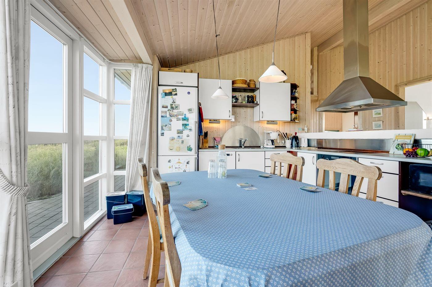 Køkkenet er udstyret med 1 køleskab. Der er 4 keramiske kogeplader, varmluftovn, mikrobølgeovn samt opvaskemaskine Der er gulvvarme i køkkenet.