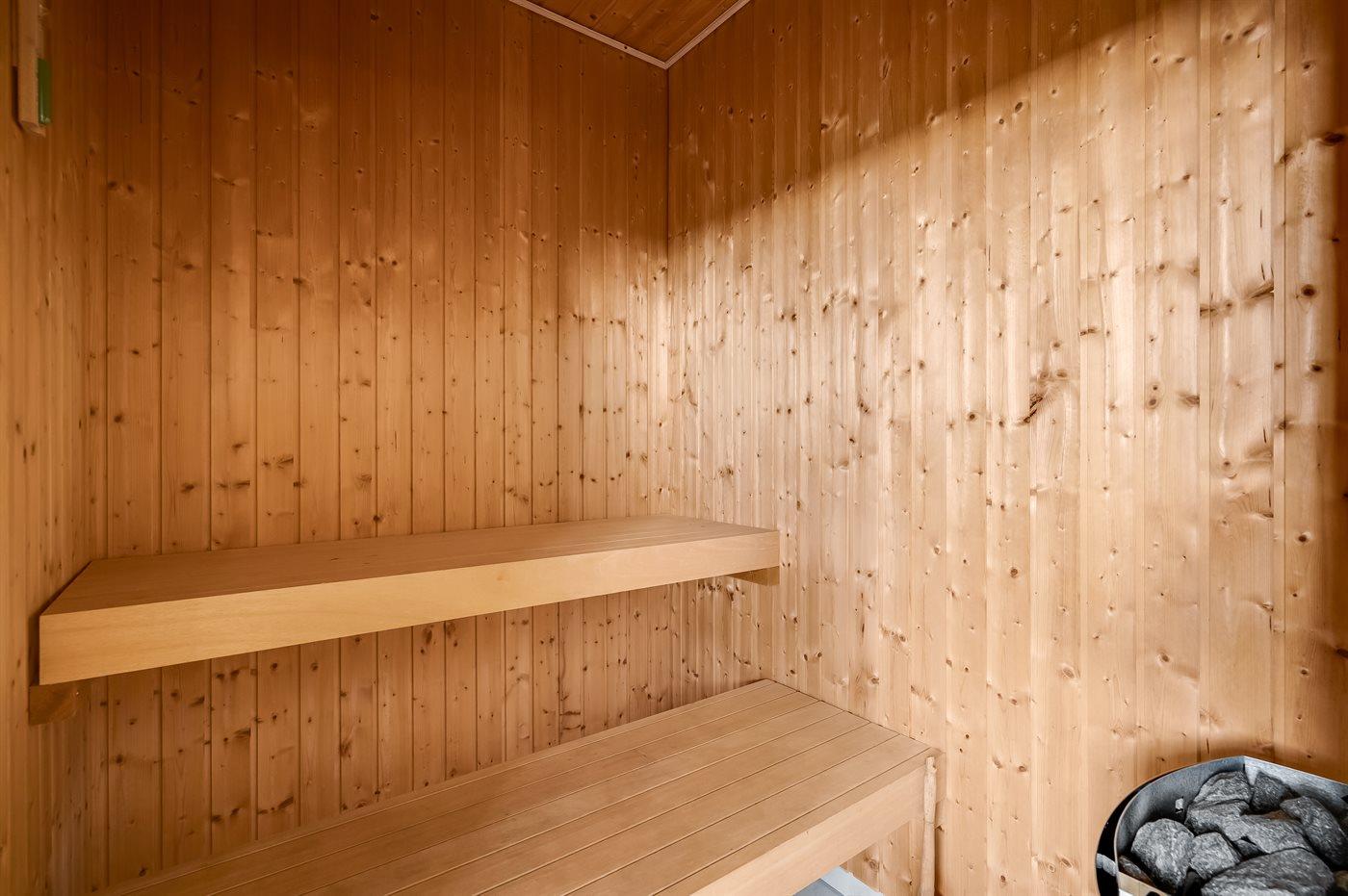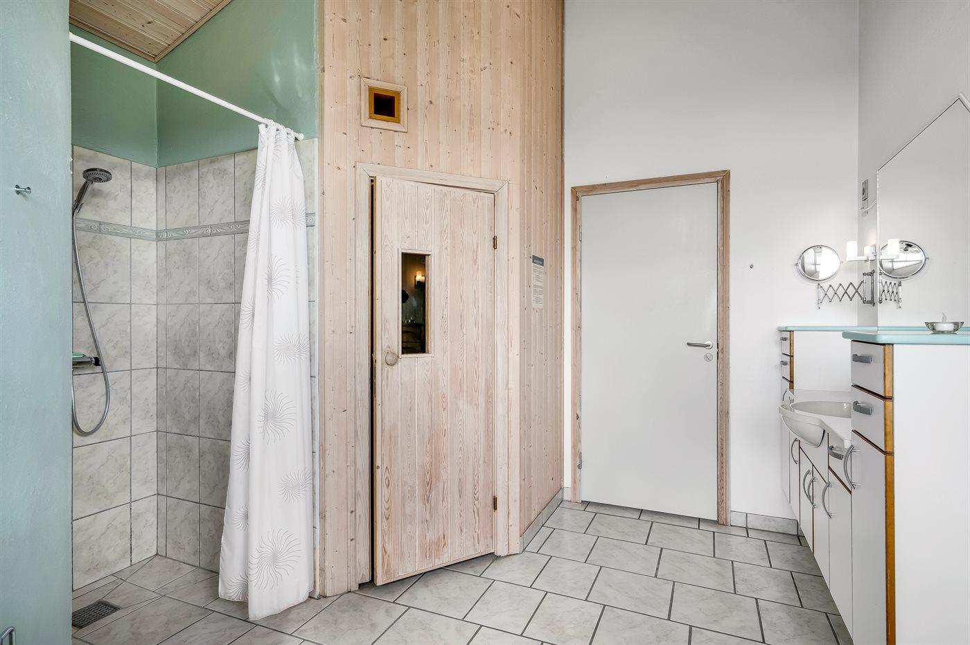 Der er 2 badeværelser med bruseniche og 2 toiletter, heraf 1 gæstetoilet. Der er gulvvarme på 2 badeværelser. Der er gulvvarme på gæstetoilettet. I saunaen er der mulighed for afslapning.