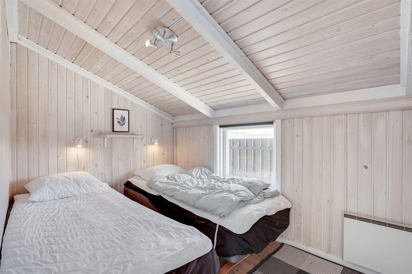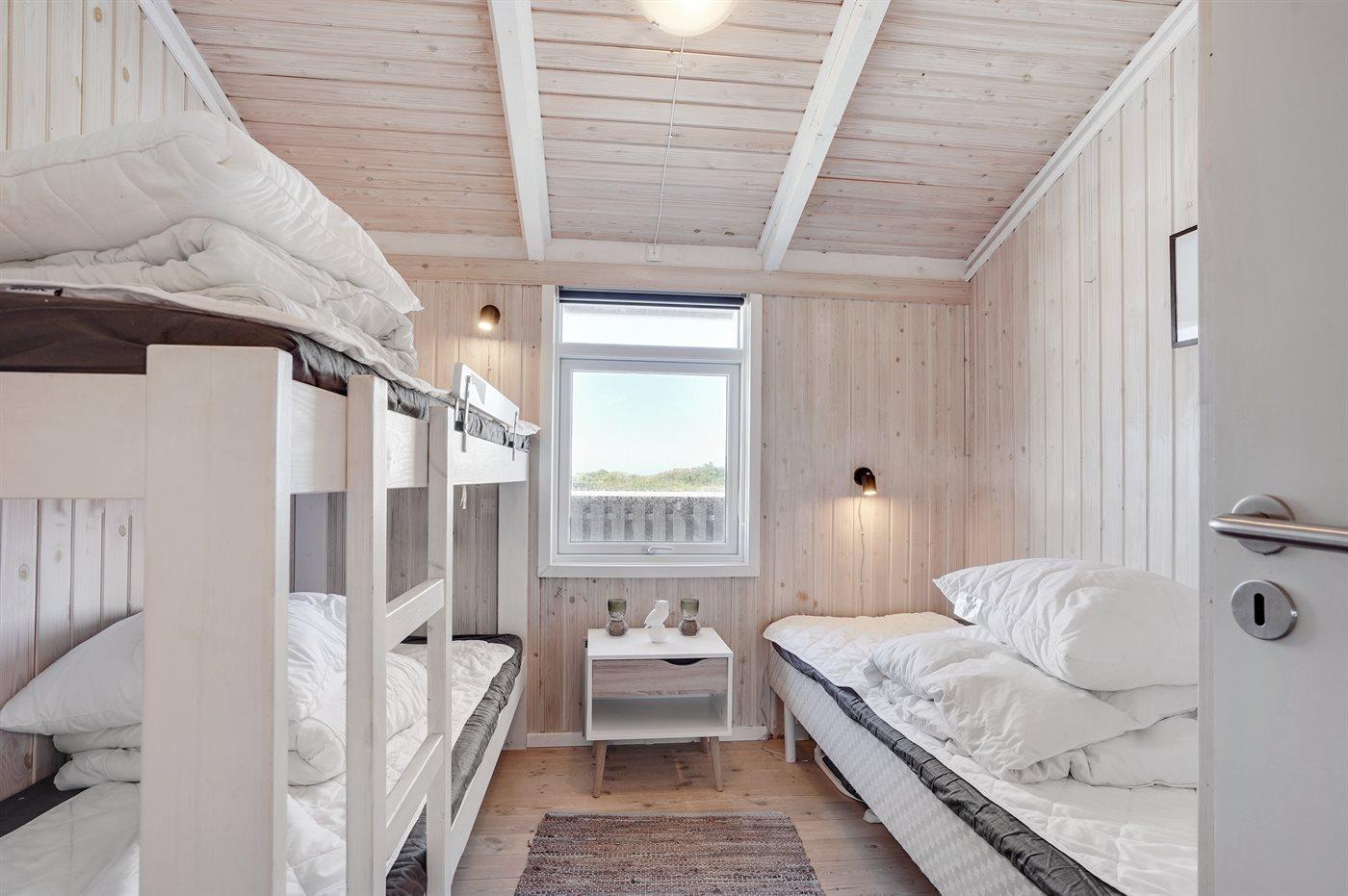 Der er i alt 3 soveværelser. Sovepladserne fordeler sig på: 4 sovepladser i dobbeltsenge. 1 soveplads i enkeltseng. 2 sovepladser i køjeseng. Derudover er der 1 stk. barneseng.