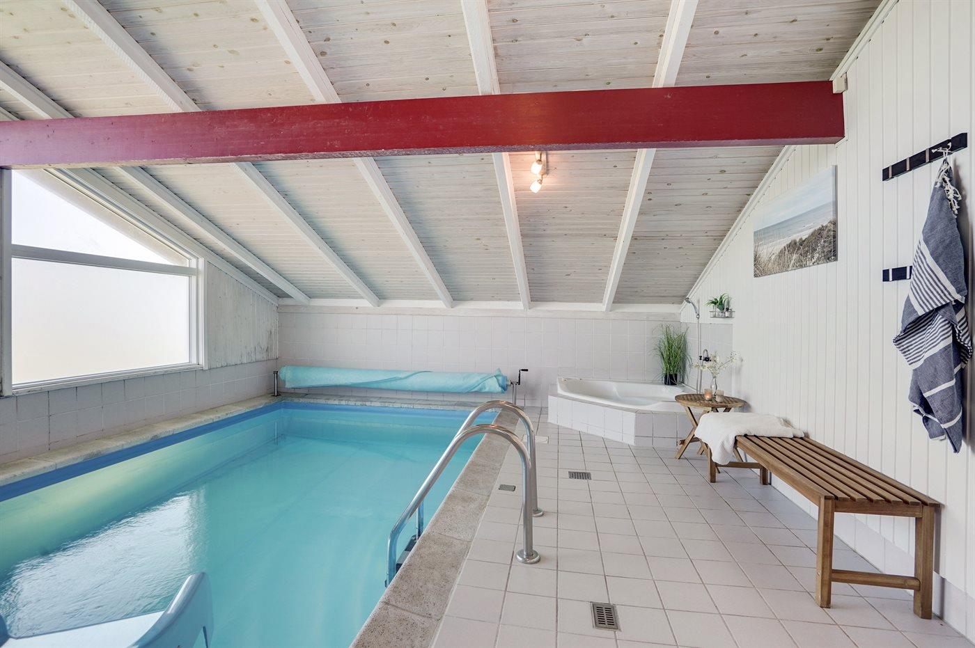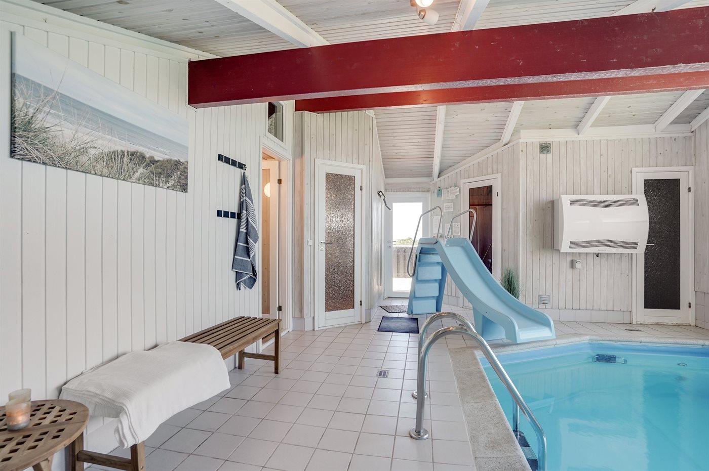 I den indendørs swimmingpool er der mulighed for leg og hyggeligt samvær. Swimmingpoolen måler op til 3 m i bredden, 5 m i længden og den er op til 1,5 m dyb. Vandet er mellem 24 og 28° C varmt. Swimmingpoolen har modstrømsanlæg. Der er gulvvarme i swimmingpoolområdet.