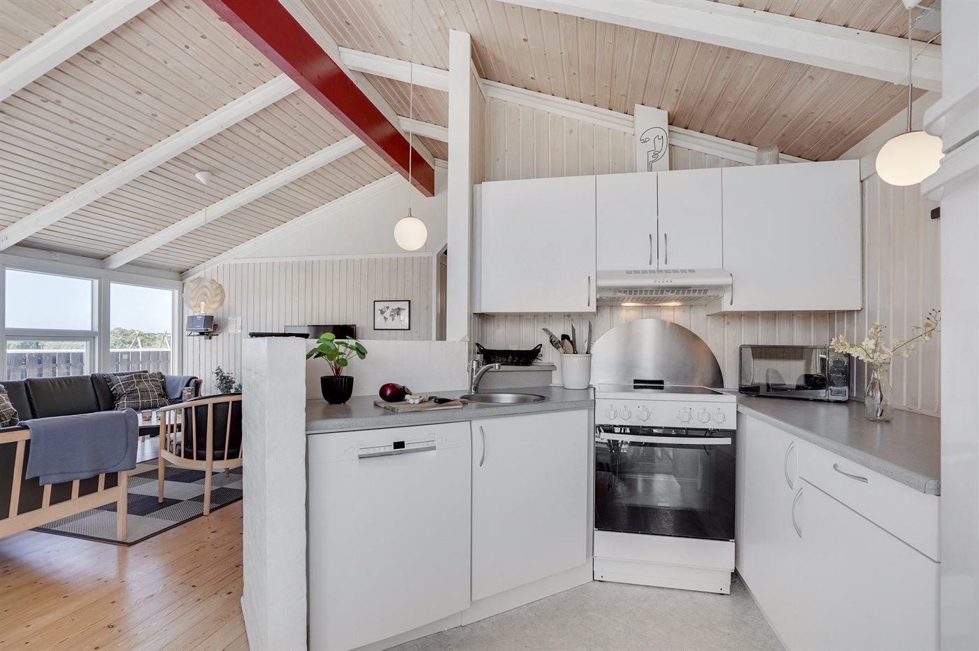 Køkkenet er udstyret med 1 køleskab. Der er 4 keramiske kogeplader, varmluftovn, mikrobølgeovn samt opvaskemaskine.
