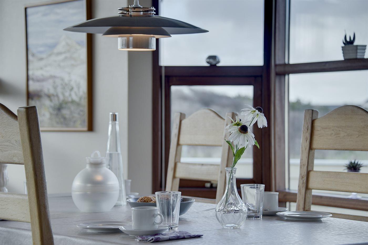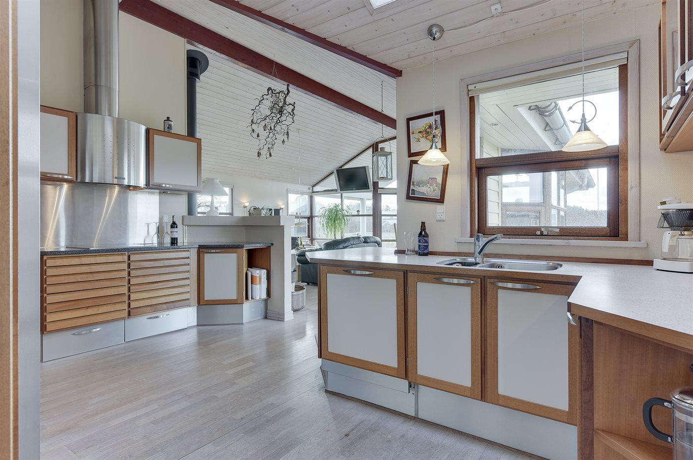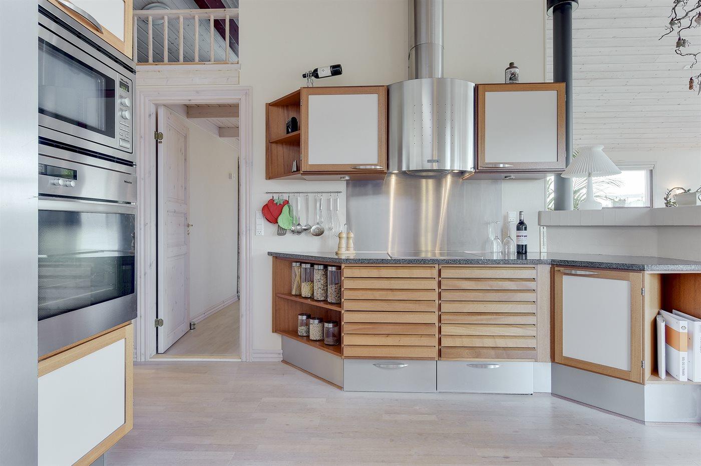 Køkkenet er udstyret med 1 amerikansk køleskab. Der er 4 keramiske kogeplader, varmluftovn, mikrobølgeovn samt opvaskemaskine.