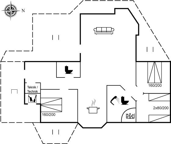 Der er i alt 3 soveværelser. Sovepladserne fordeler sig på: 4 sovepladser i dobbeltsenge. 2 sovepladser i enkeltsenge. Derudover er der 1 stk. barneseng.