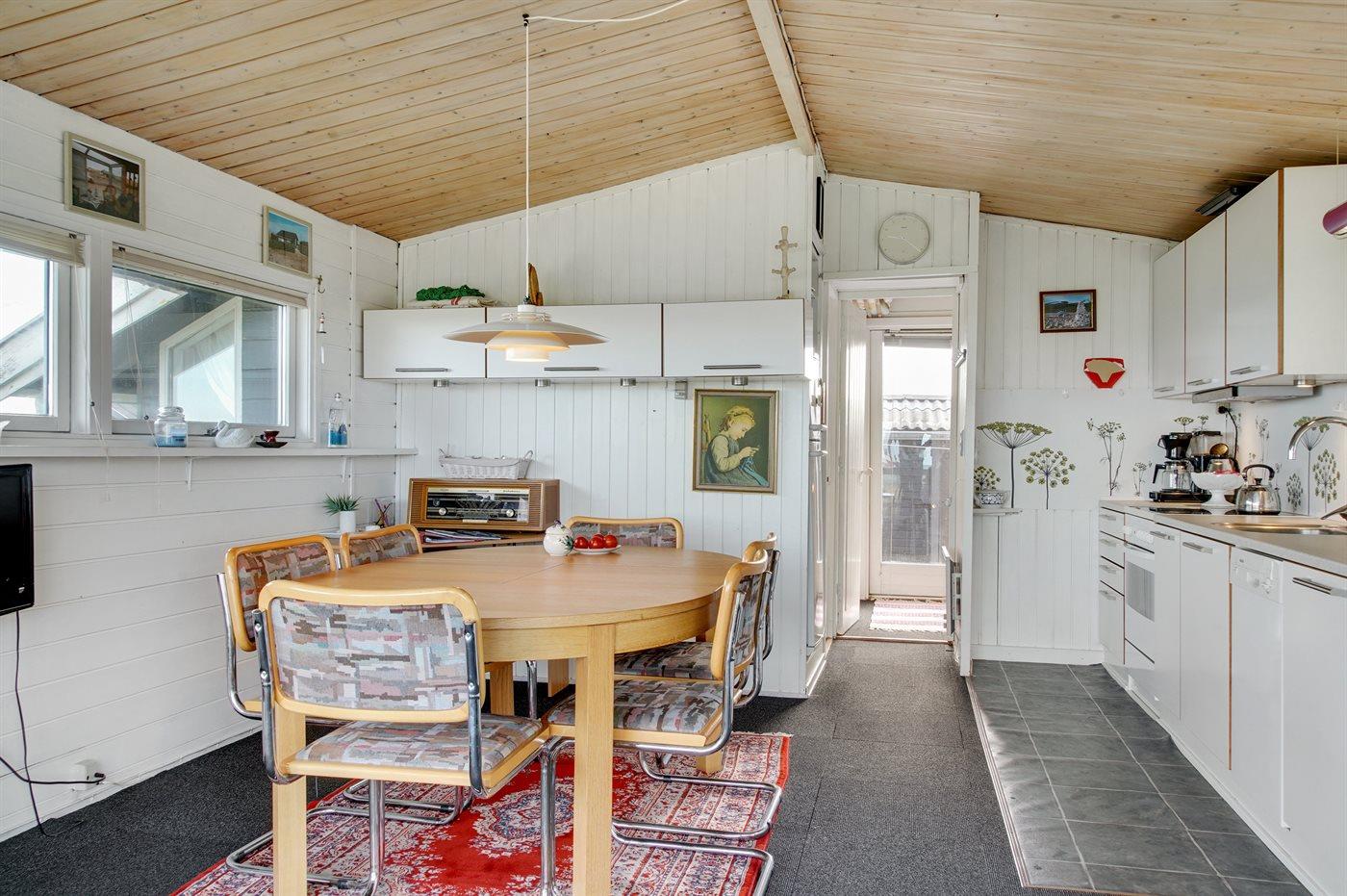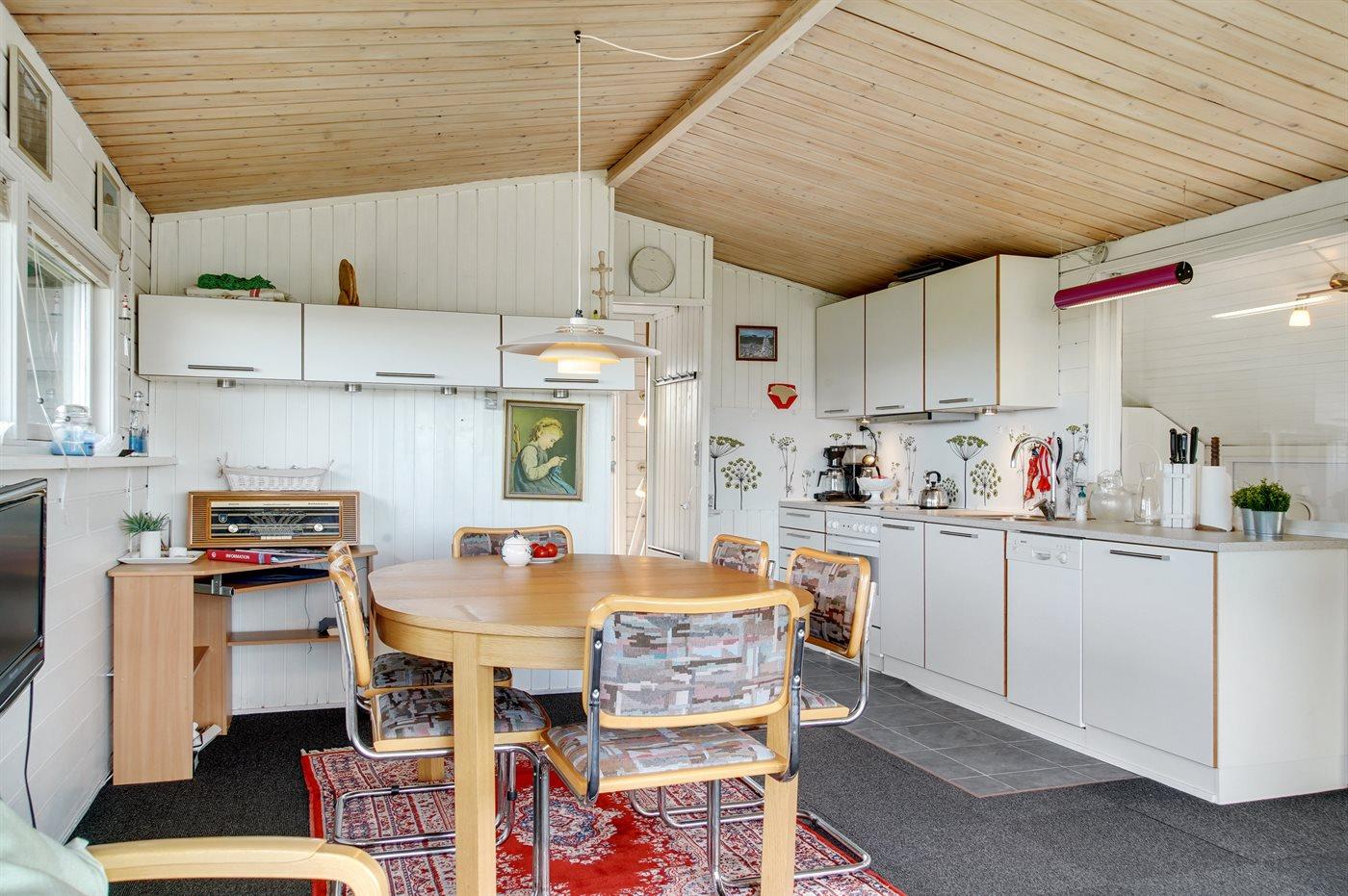 Køkkenet er udstyret med 1 køleskab. Der er 4 keramiske kogeplader, varmluftovn, mikrobølgeovn samt opvaskemaskine.