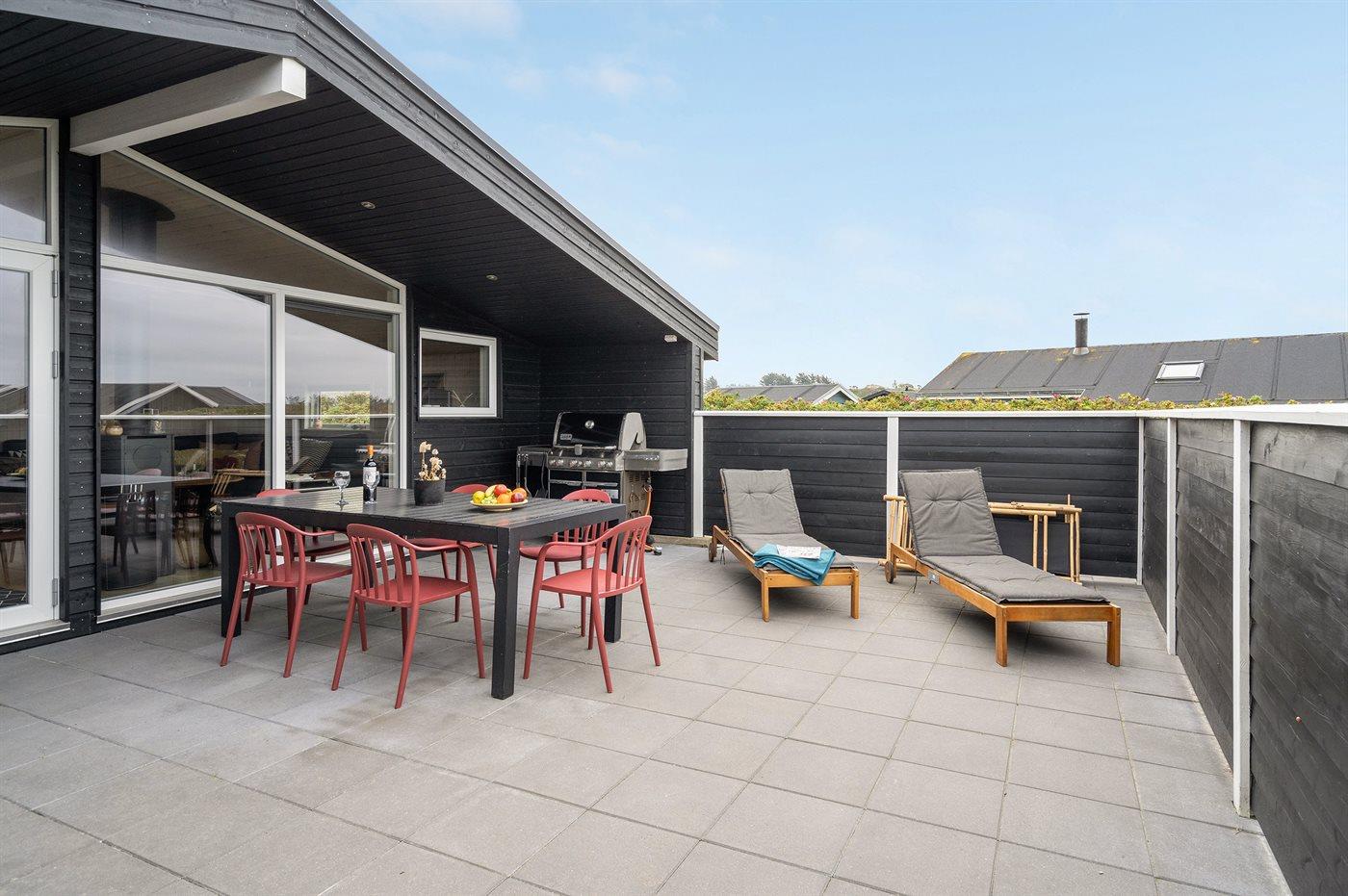Ferieboligen er beliggende på en 1260 m² stor naturgrund. Der er 300 m til havet. Nærmeste forretning er beliggende i en afstand af 1500 m. Til ferieboligen hører 90 m² terrasseareal. Desuden er der 10 m² overdækket terrasse. Udendørs bruser. Grill til rådighed. Parkering ved ferieboligen.